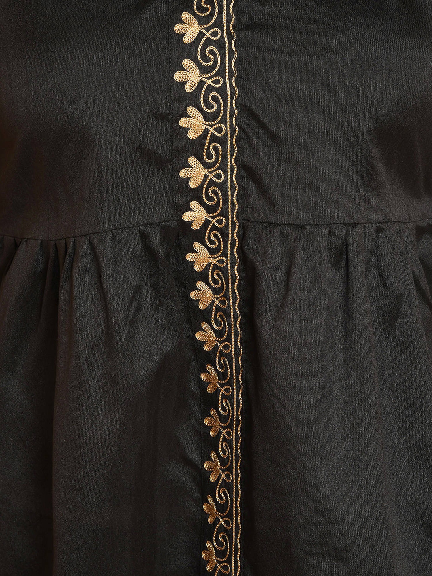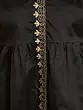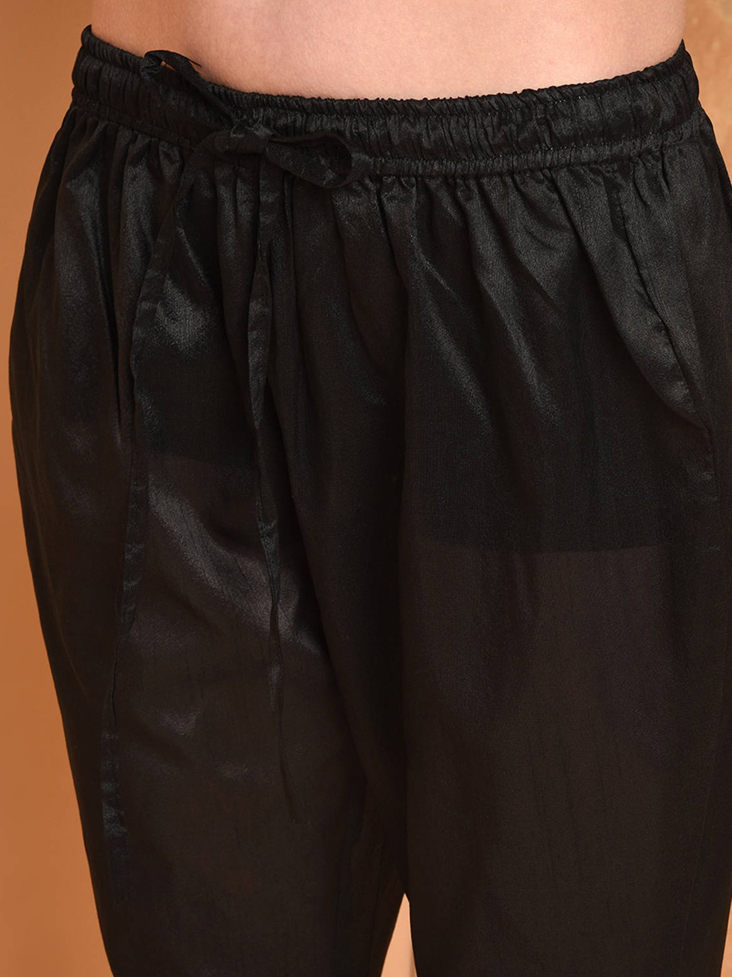 Complementing the beautifully designed kurta is a pair of straight-fit trousers, also in a rich black shade. The clean lines and comfortable cut of the pants ensure a polished and cohesive look. Made from a breathable and smooth fabric, these pants offer ease of wear without compromising on style. The straight silhouette provides a modern contrast to the flared kurta, creating a balanced and sophisticated ensemble. This set is designed to make you feel as comfortable as you look stunning, allowing you to fully enjoy your celebrations.