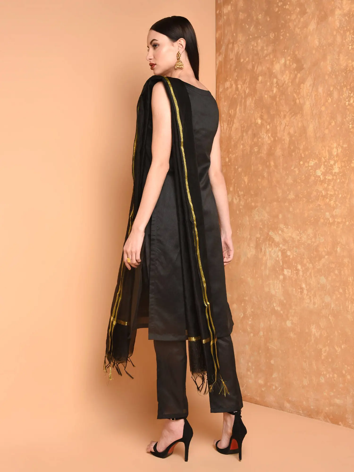 To complete this breathtaking set is a diaphanous Chanderi dupatta. Known for its lightweight texture and delicate sheen, Chanderi fabric adds an element of ethereal beauty. The dupatta is generously sized, allowing for versatile styling. Drape it elegantly over your shoulders for a classic look, or experiment with more contemporary drapes to showcase its intricate weave and subtle shimmer. Delicate gold borders and a fringed hem add the final touch of opulence, creating a stunning contrast with the richness of the silk. This dupatta is the perfect accessory to elevate the entire outfit, adding a touch of refined artistry.