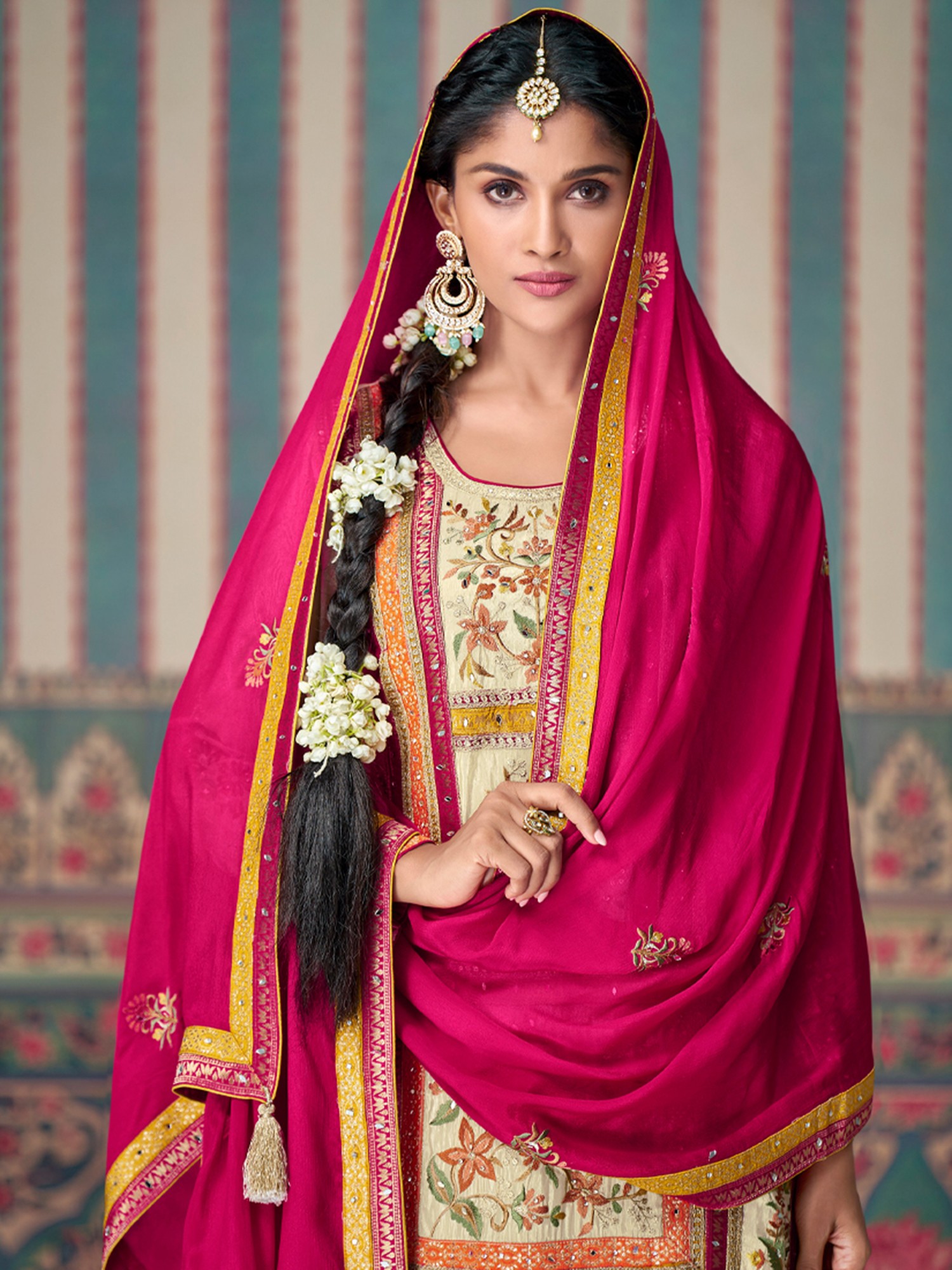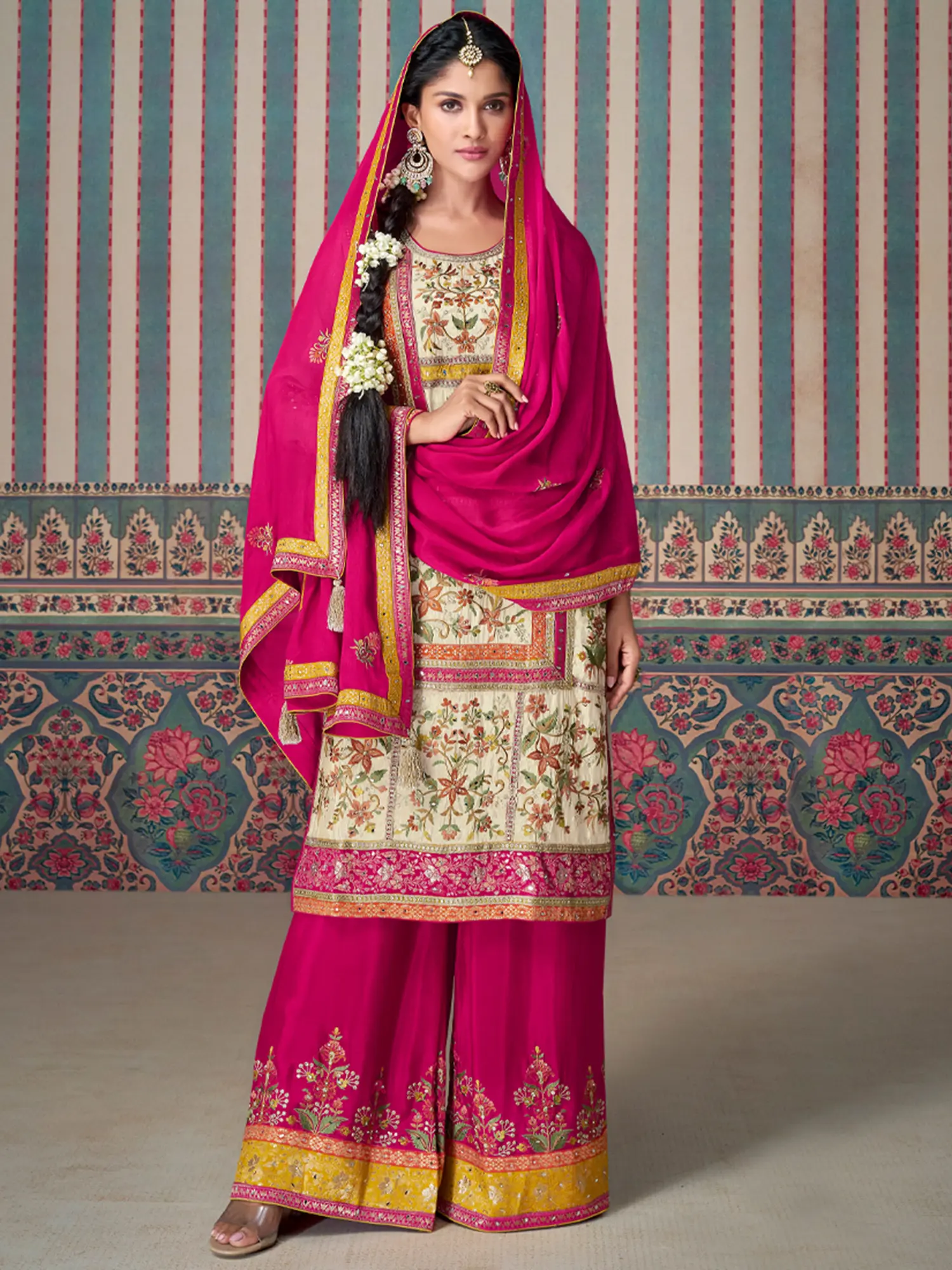 Elegant Chinon Gharara Suit With Floral Print And Embroidery For Festive Wedding And Party Wear For Women