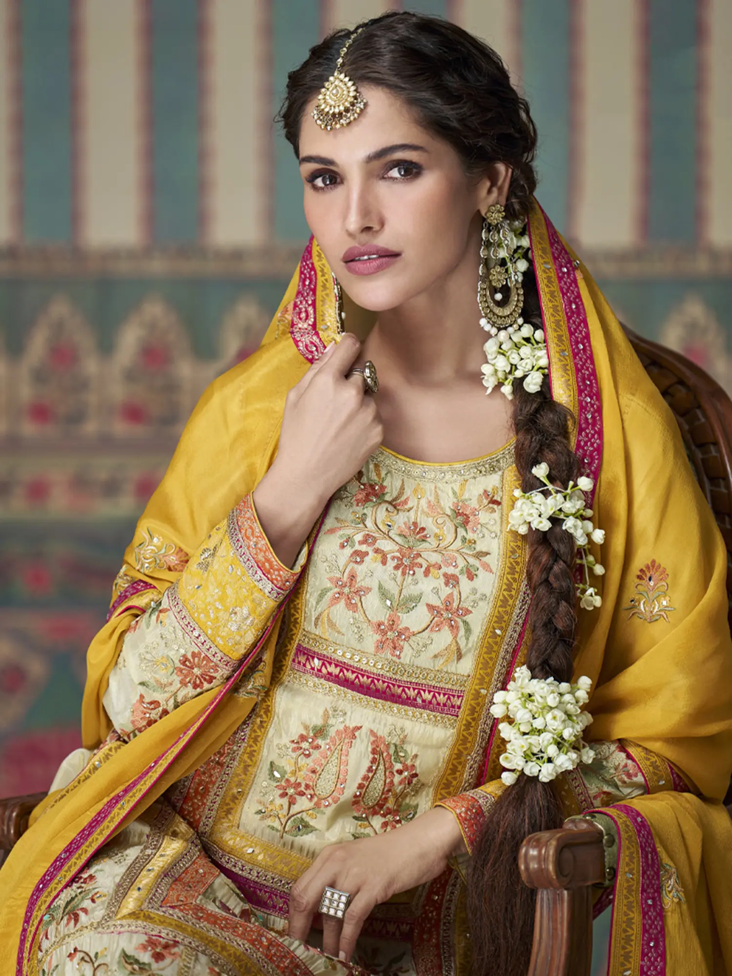 Women's Printed Russian Silk Gharara Suit With Heavy Thread Sequin Embroidery Wedding Party And Festive Wear