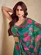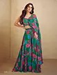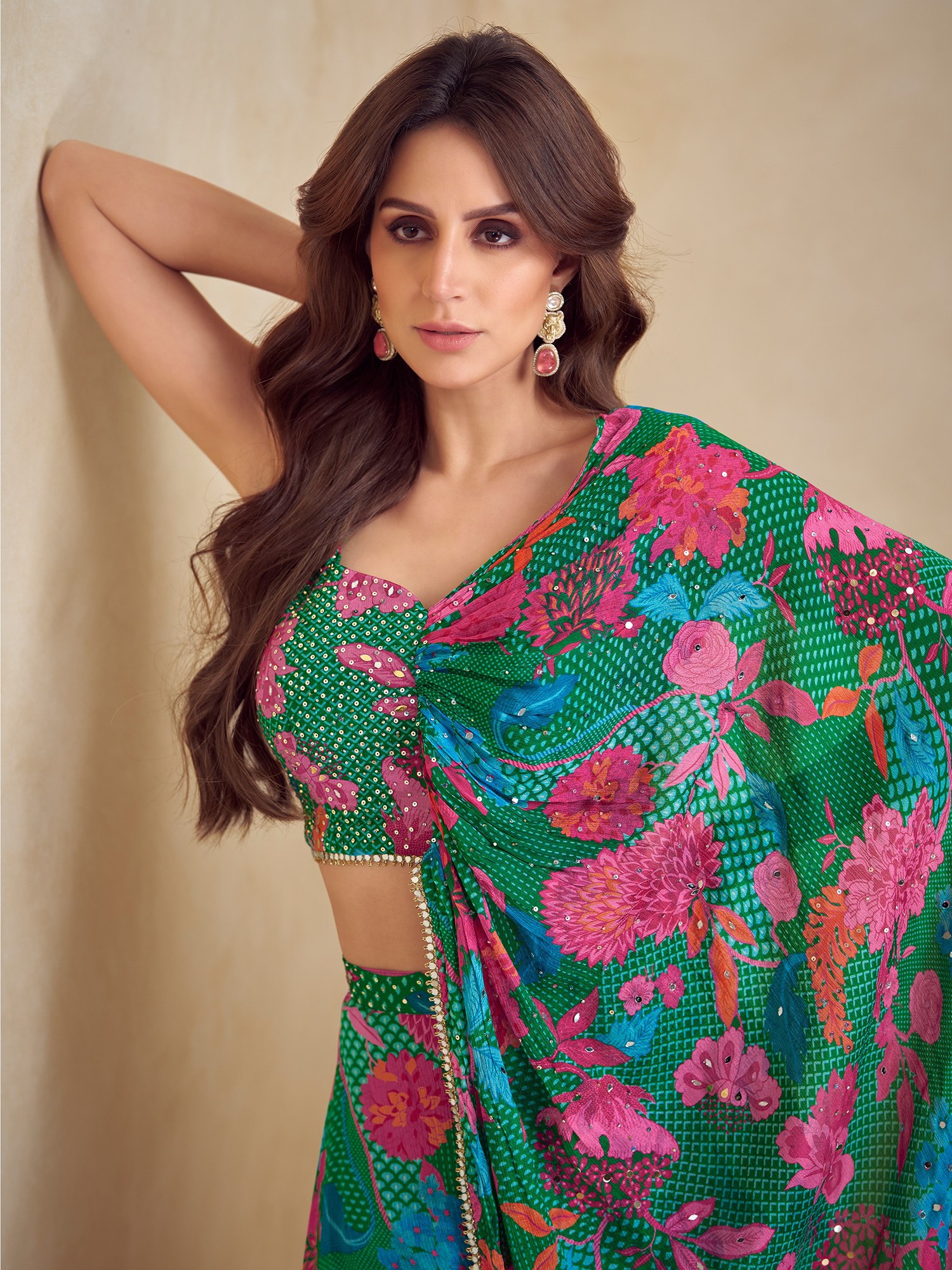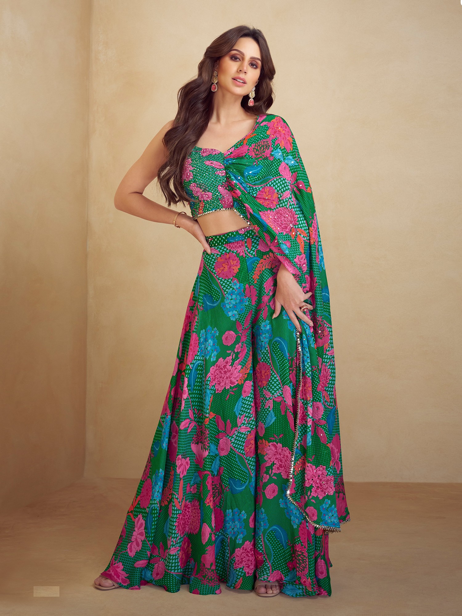 Step into a world of captivating charm with this exquisite Chinon Palazzo Salwar Suit. Designed for the modern woman who appreciates both tradition and contemporary flair, this ensemble is a celebration of vivid colors and intricate artistry. The rich green base serves as a breathtaking canvas for a riot of floral motifs, rendered in striking shades of fuchsia, teal, and sky blue. Each bloom is meticulously detailed, creating a visual symphony that is both lively and sophisticated.