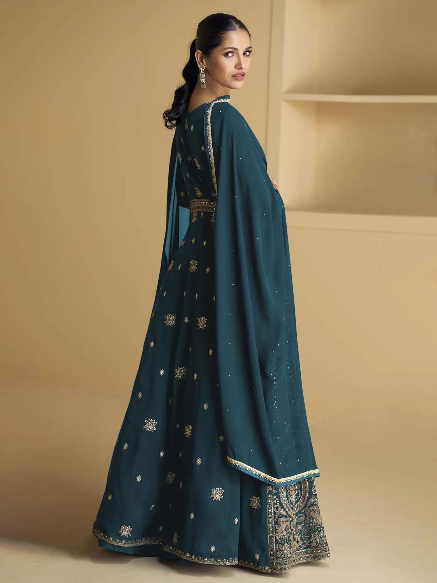 Step into a realm of unparalleled sophistication with this exquisite georgette gown ensemble. Designed to captivate, this outfit is a masterpiece of traditional craftsmanship fused with contemporary allure. The rich, deep teal hue of the georgette fabric serves as a luxurious canvas for the intricate, heavy embroidery that adorns the entire gown. Each motif, meticulously detailed in shimmering gold thread, tells a story of heritage and opulence, ensuring you will be the center of attention at any special occasion.