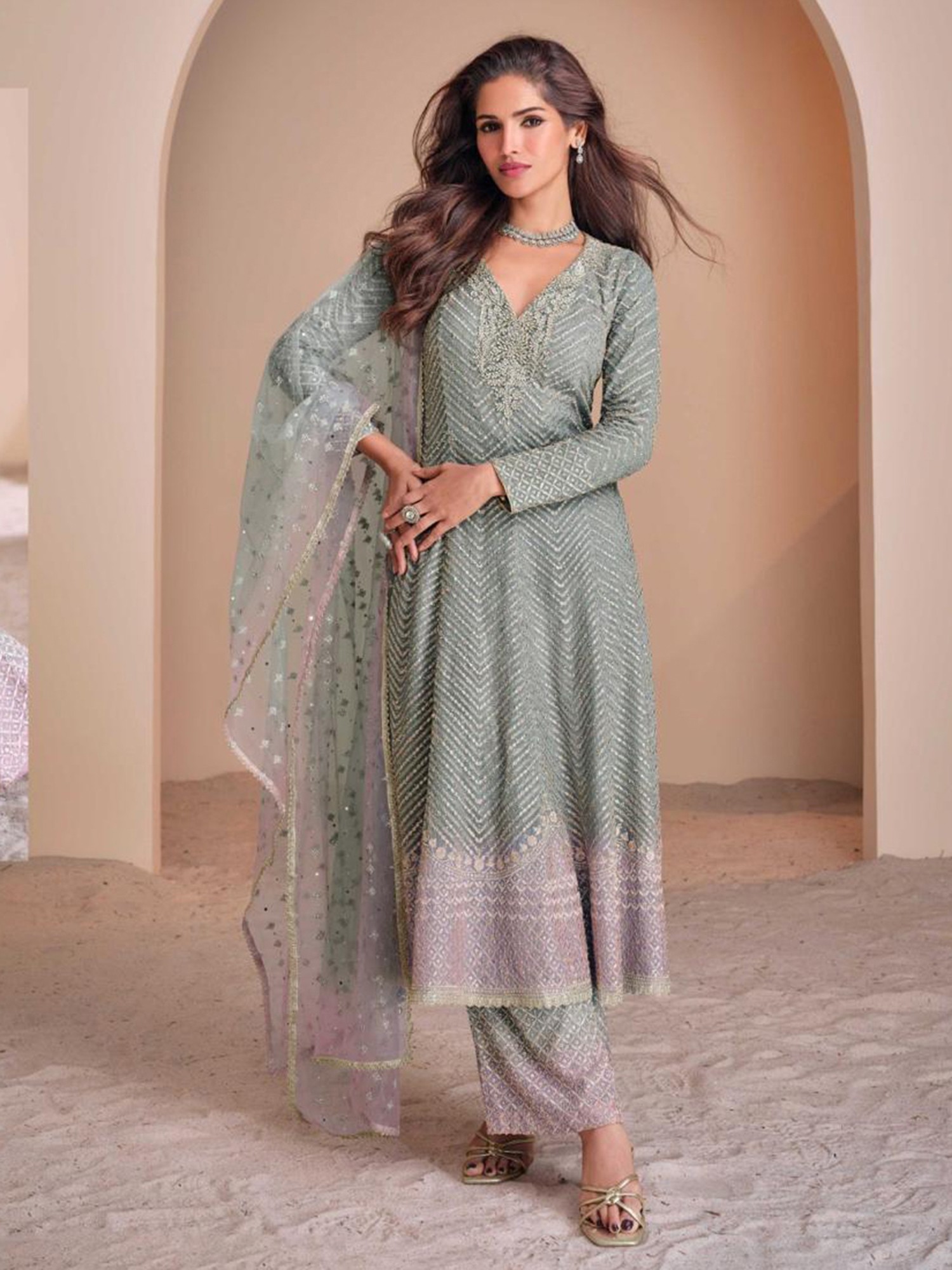 Women's Georgette Salwar Suit With Net Dupatta Heavy Thread Sequin Dori Embroidery Party Wear Designer Suit