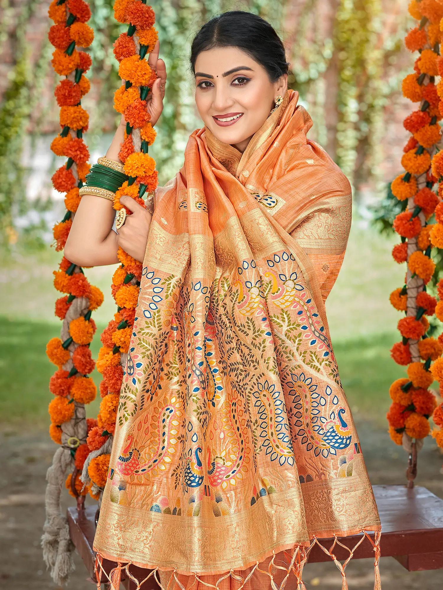 What sets this saree apart is its captivating Meena Kari work. This intricate embroidery, a hallmark of traditional Indian craftsmanship, adorns the fabric with vibrant hues and delicate motifs. The Meena Kari depicts charming scenes, with elegant peacocks and floral patterns rendered in a breathtaking array of colors. Each motif is meticulously woven, creating a rich tapestry of texture and visual appeal. The interplay of the golden silk base with the colorful Meena work results in a stunning contrast that is both eye-catching and sophisticated, making this saree a true conversation starter.