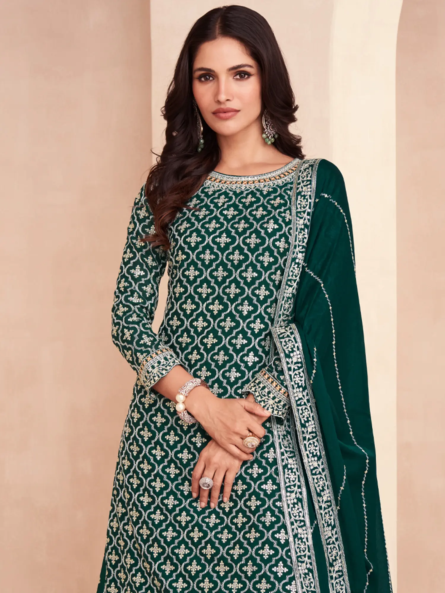 Luxe Simar Silk Gharara Suit Set With Chinon Dupatta And Santoon Bottom In Floral Embroidered Design