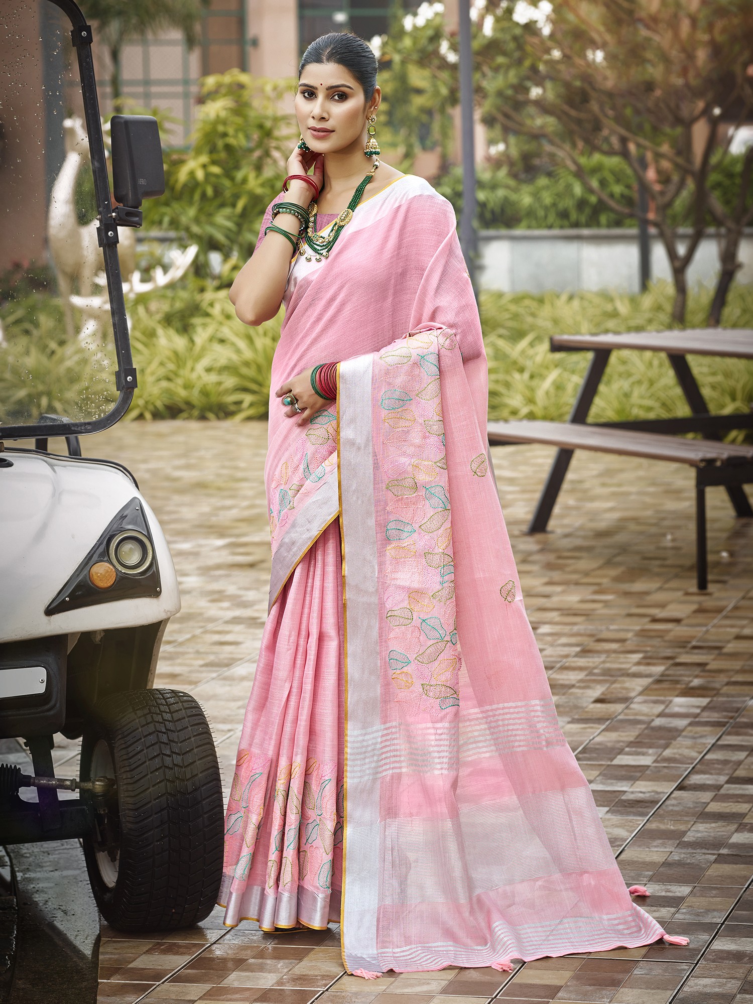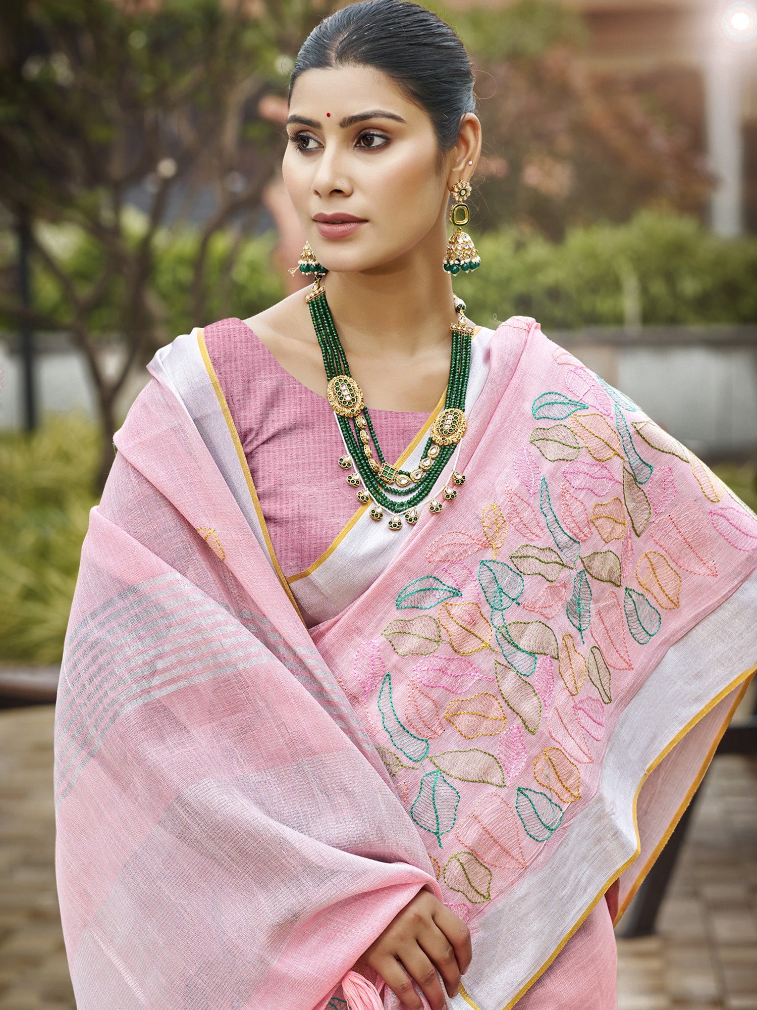 The true charm of this saree lies in its delicate detailing. A charming leaf motif, rendered in subtle woven threads of pastel shades like pale green, soft yellow, and a hint of blush, dances across the fabric. These intricate patterns are not overpowering but rather add a touch of artistic flair that catches the eye. The body of the saree features a beautiful interplay of horizontal stripes in white and silver, interspersed with the soft pink. A classic silver border with a thin golden trim frames the drape, adding a touch of refined luxury. The pallu is adorned with a more concentrated display of the leaf motif, creating a captivating focal point. The tactile quality of the linen fabric ensures breathability and a luxurious feel against the skin, promising comfort throughout the day.
