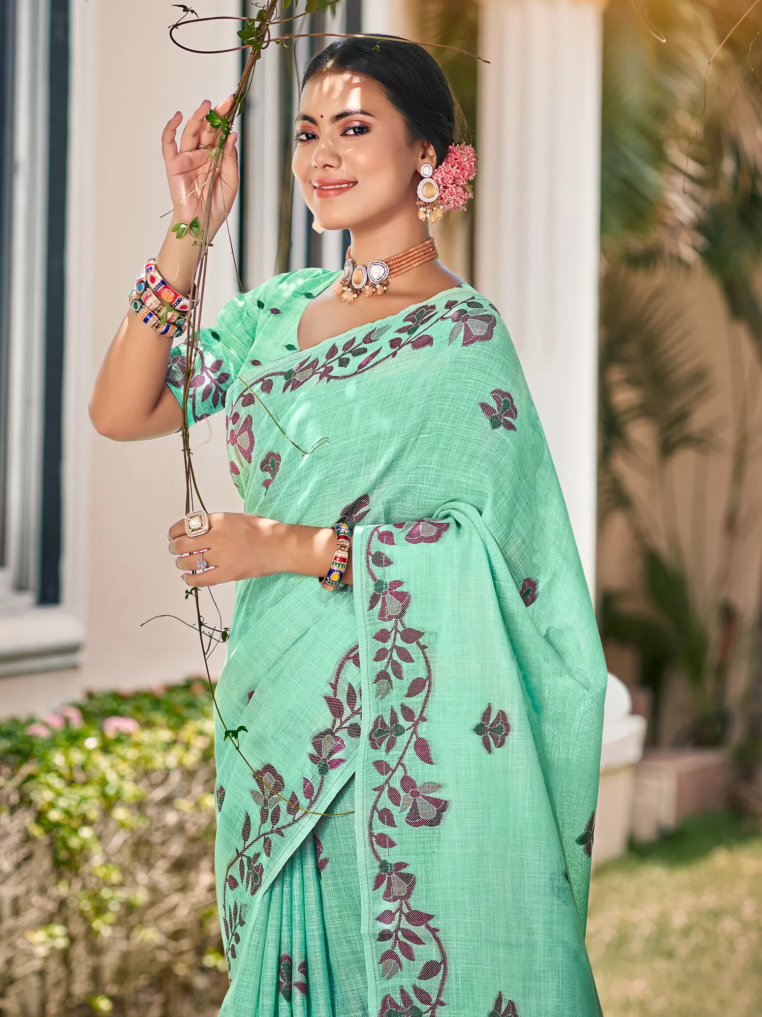 Exquisite Linen Saree with Blooming Floral Embroidery