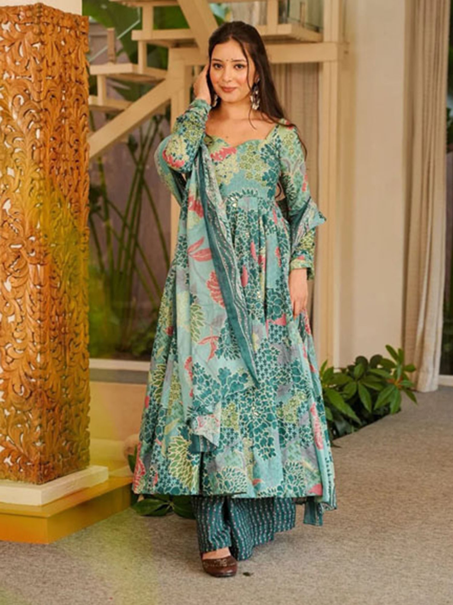 This ensemble draws inspiration from the timeless allure of traditional Indian attire, reimagined for the contemporary connoisseur. The Anarkali silhouette, with its flowing grace and regal flair, has graced courts and celebrations for centuries, embodying feminine beauty and poise. You embrace a legacy of elegance with every wear.
