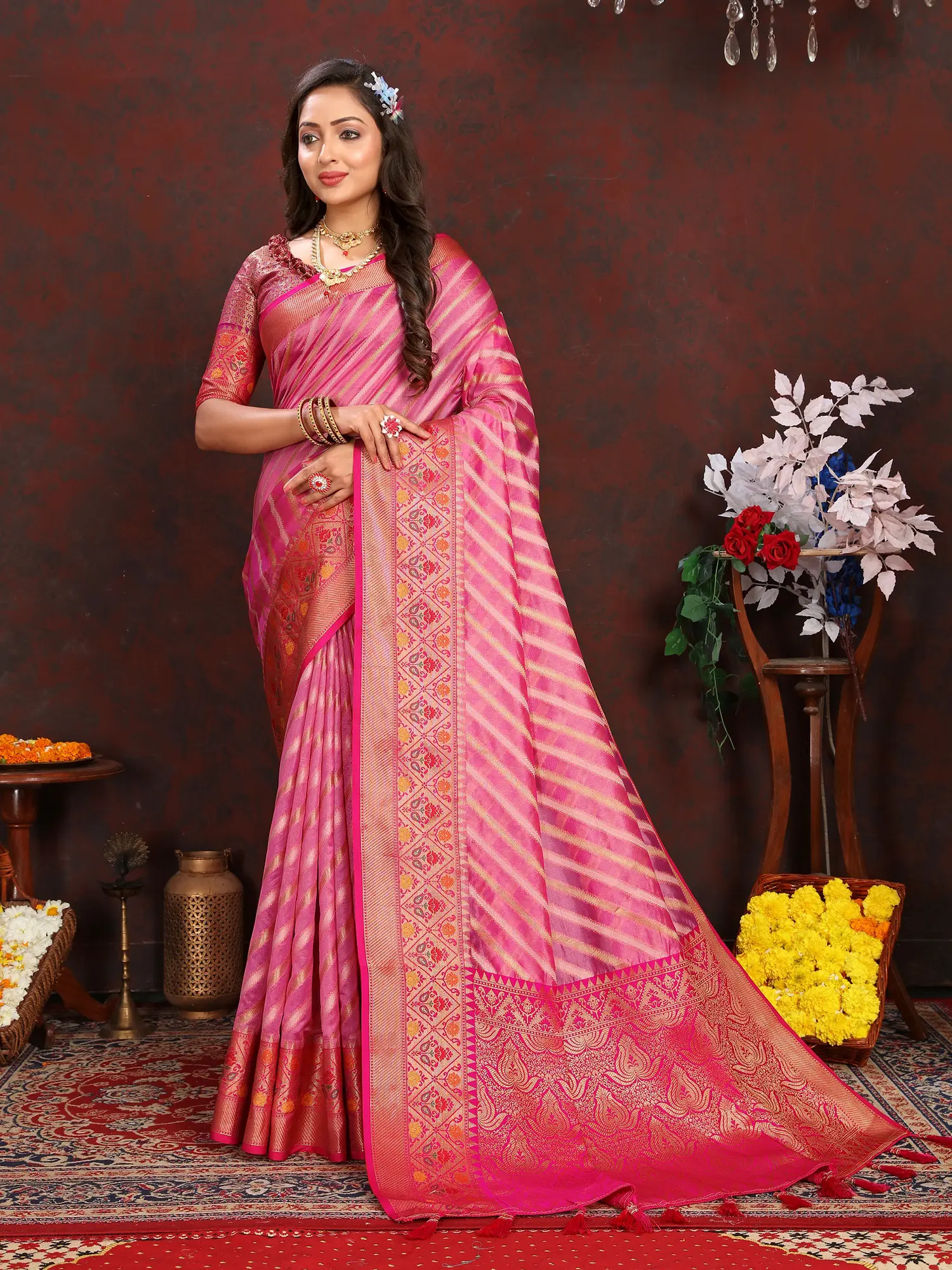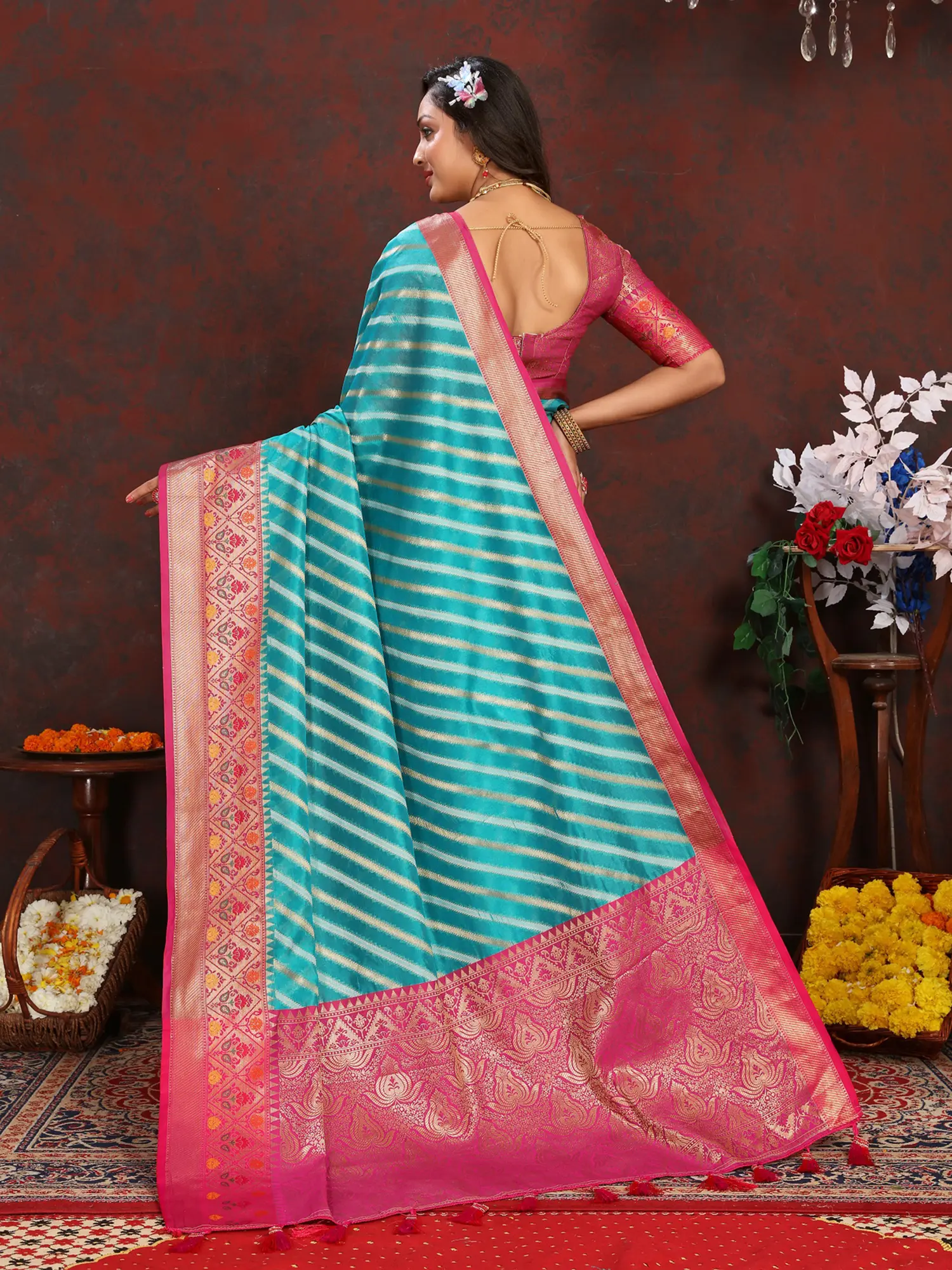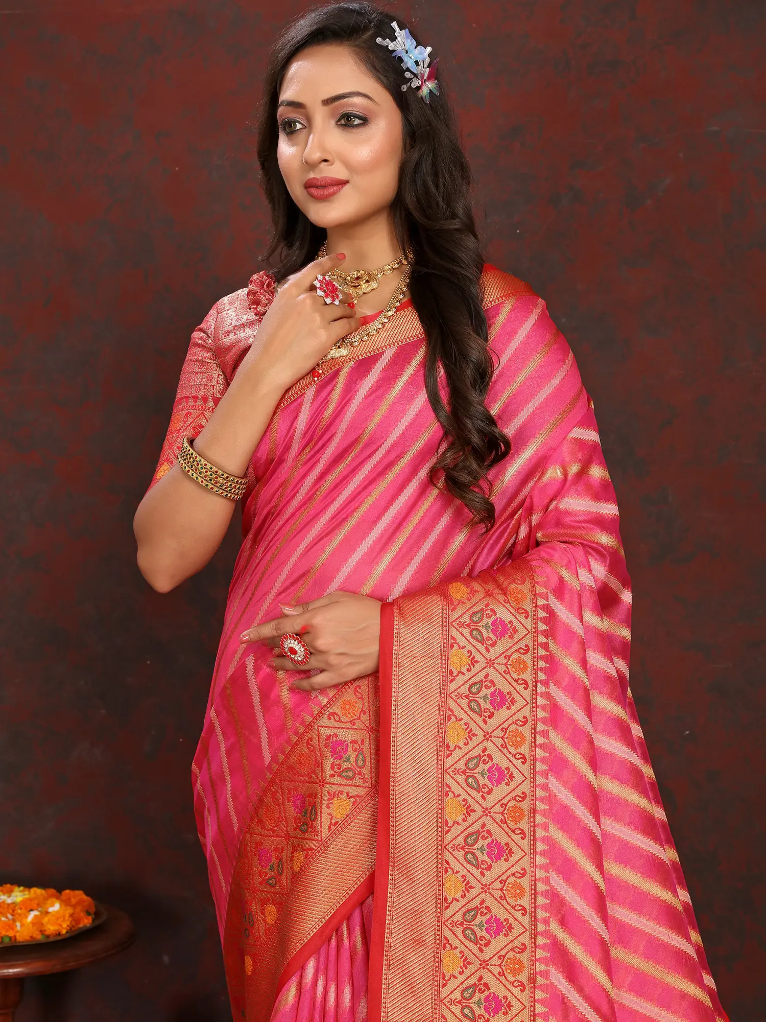Elegant striped pattern woven throughout the saree body adds visual depth.