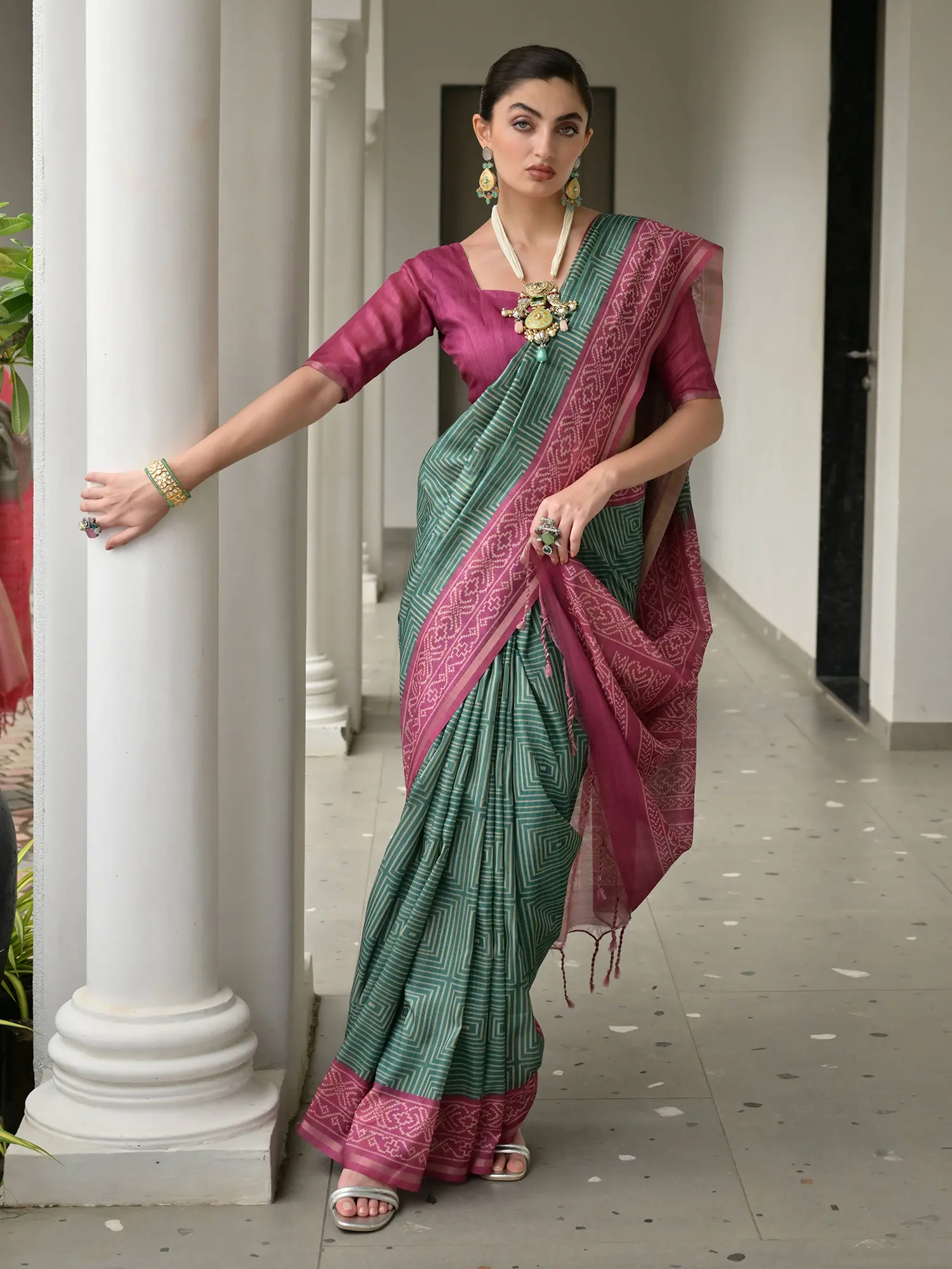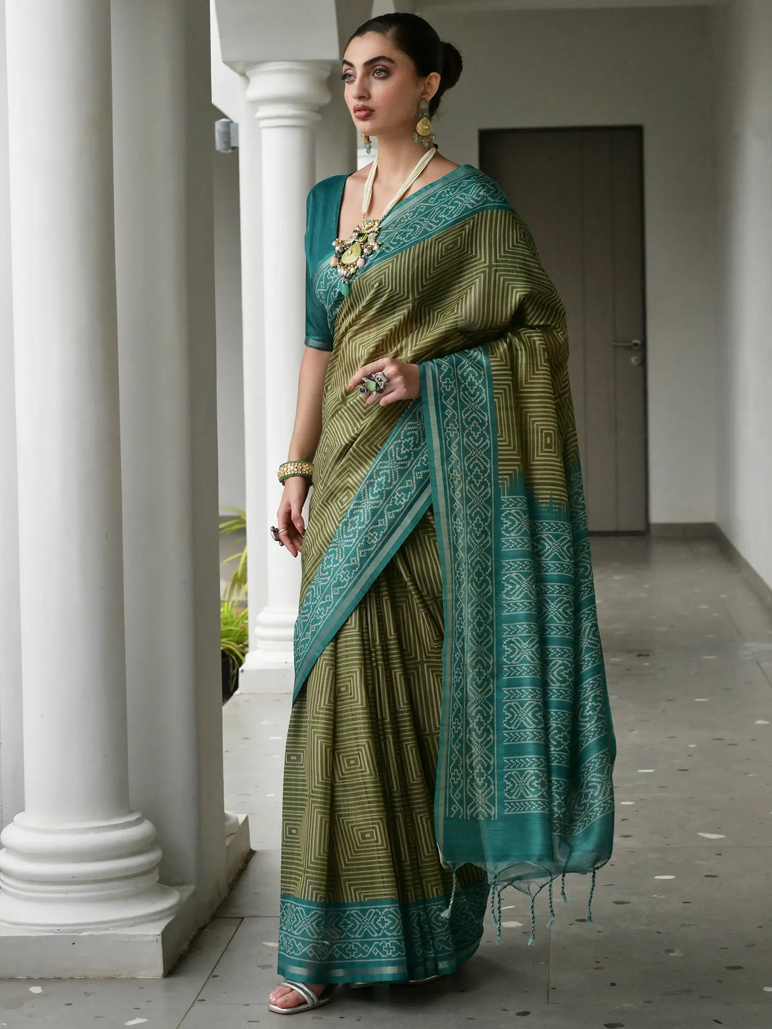 The true charm of this saree lies in its stunning Ikkat pallu and border. Ikkat, a traditional Indian textile art, involves resist dyeing of the yarn before it is woven. This meticulous process results in characteristic blurred edges and mesmerizing geometric patterns that are instantly recognizable. The pallu and border of this saree showcase this artisanal technique with remarkable precision, featuring a harmonious interplay of deep hues and delicate motifs that draw the eye and tell a story of heritage. The geometric designs are both contemporary and classic, adding a unique visual appeal that sets this saree apart.
