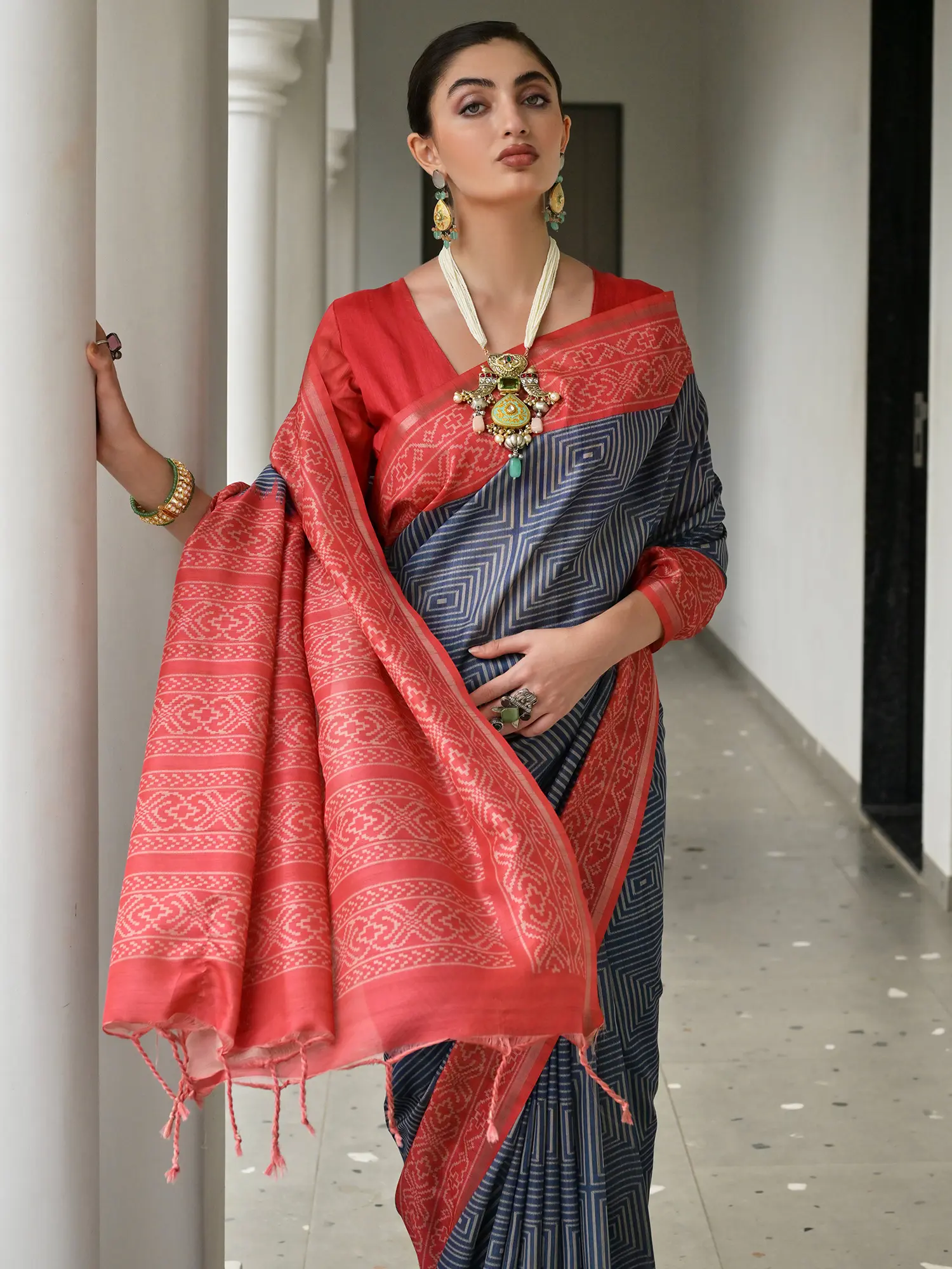 The base of the saree presents a captivating geometric pattern in a subtle yet striking combination of colors. This understated design beautifully complements the more prominent Ikkat work on the pallu and border, creating a balanced and harmonious aesthetic. The softness of the Tussar silk ensures that the saree drapes gracefully, enhancing the natural silhouette and offering comfort along with style. The rich texture of the silk adds depth and dimension to the overall look, making it a true delight to touch and wear.