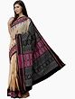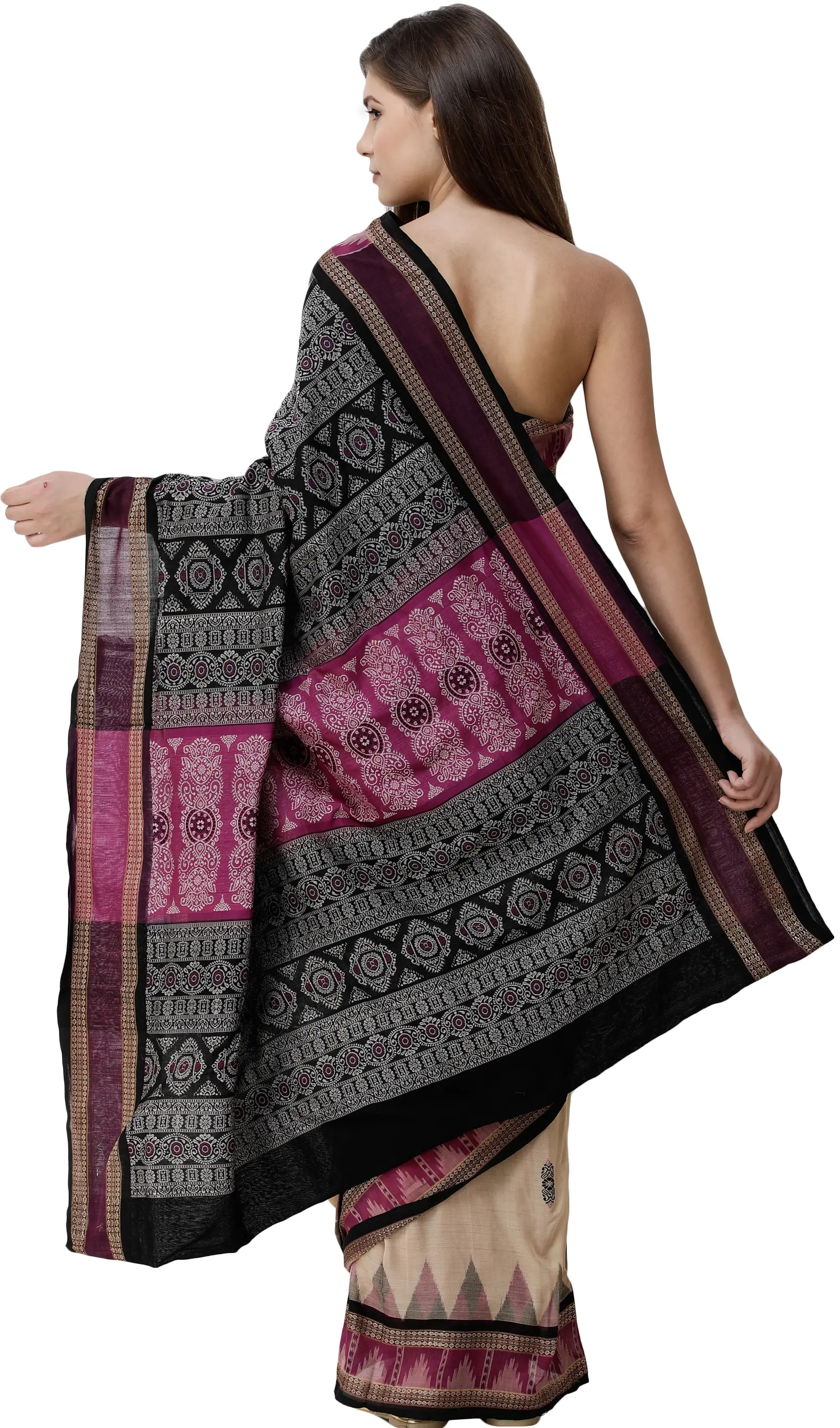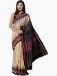 Cactus-Flower Pure Cotton Ikat Handloom Saree with Woven Fish Wide Border and Lady Figure Motifs from Sambhalpur