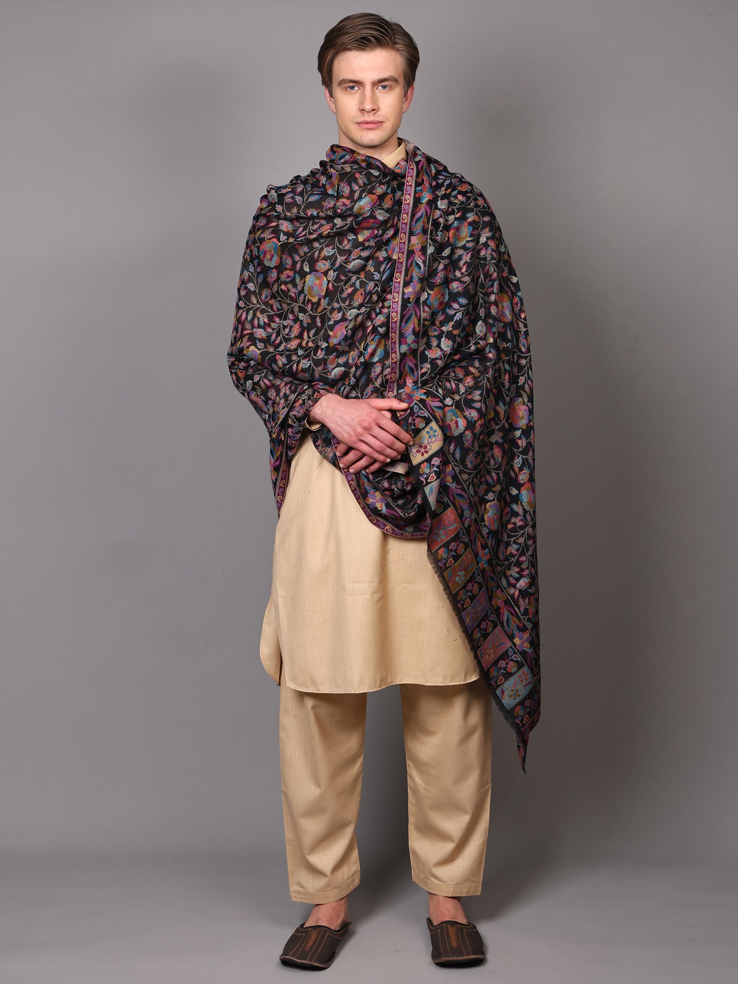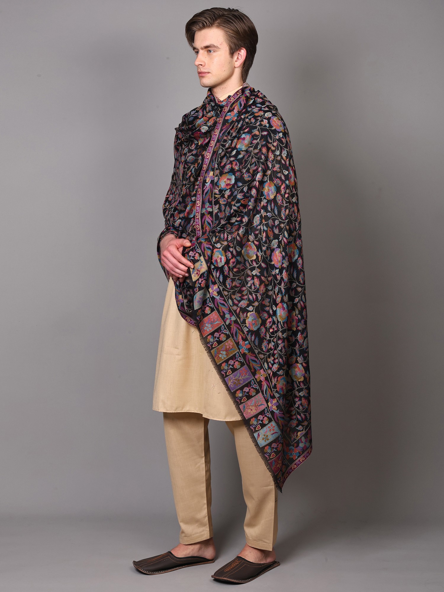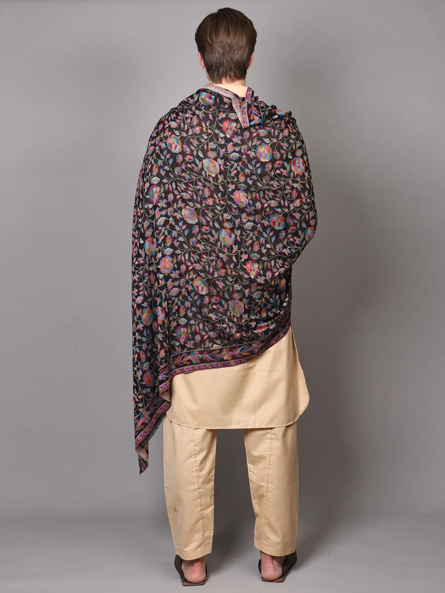 Experience the rich heritage and intricate artistry of Punjab with this exquisite wool Jamawar shawl. Crafted from the finest wool, this shawl is more than just an accessory; it's a wearable piece of art, showcasing a tradition of textile excellence passed down through generations. The deep, versatile black backdrop serves as the perfect canvas for a breathtaking display of multicolor floral paisleys, each woven with meticulous care and attention to detail. This traditional motif, a symbol of fertility and life, is rendered in a vibrant palette that evokes the beauty of a blooming garden, adding a touch of opulence and charm to any ensemble.