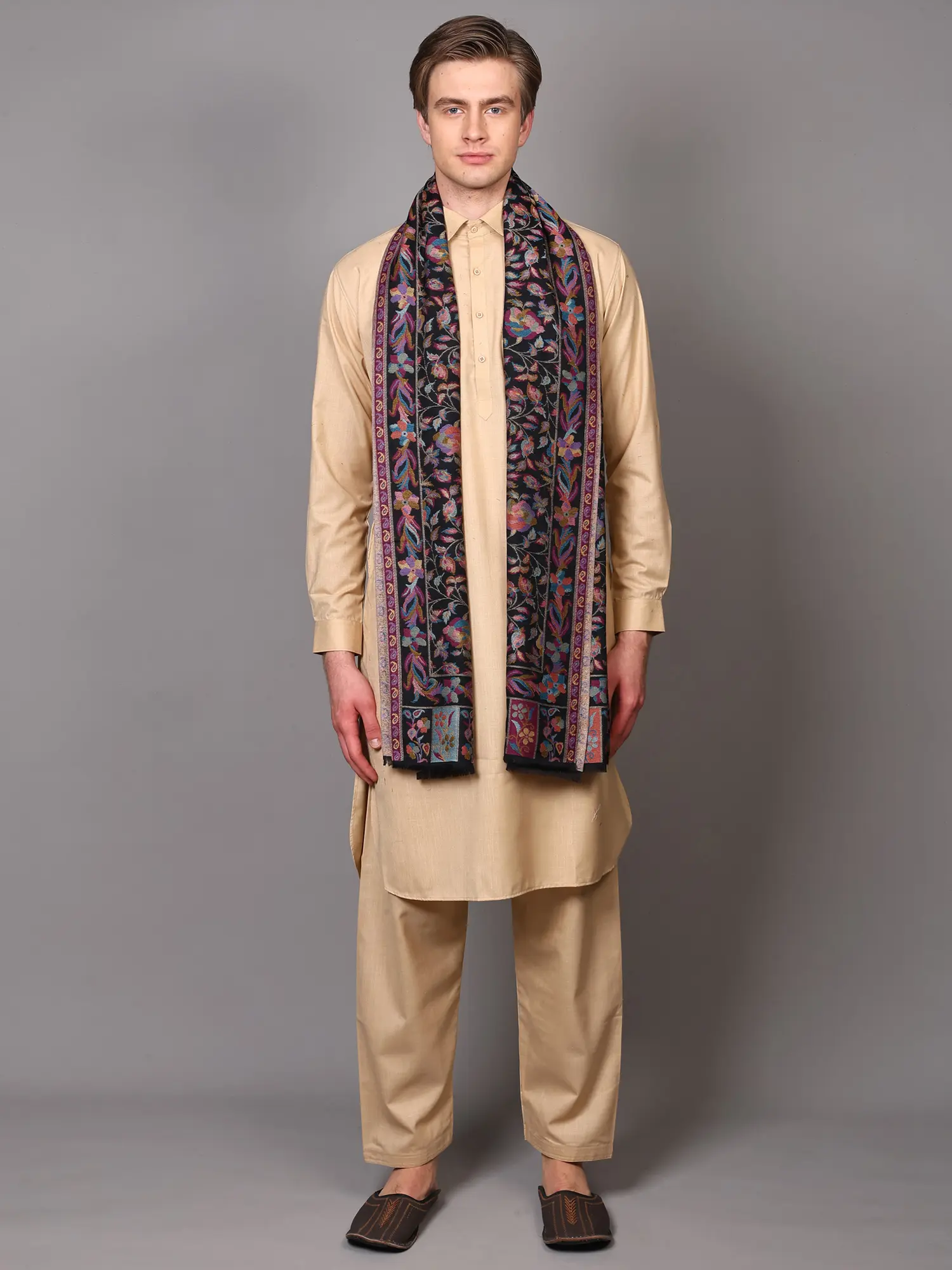 This shawl is a testament to enduring style, designed to transcend seasons and trends. Its generous size ensures it can be draped in various ways, offering both warmth and a statement of refined taste. Whether you choose to elegantly cascade it over your shoulders for a formal occasion, wrap it snugly for a touch of cozy luxury, or style it as a striking accent over a Kurta-Pajama set, this shawl promises to elevate your look. It is an ideal addition to a discerning gentleman's wardrobe, offering a touch of regal sophistication and a connection to artisanal traditions. The natural properties of wool provide exceptional warmth and comfort, making it a perfect companion for cooler evenings or a sophisticated layer for any outfit. Embrace the artistry and warmth of this remarkable piece, a true celebration of Punjabi textile artistry.