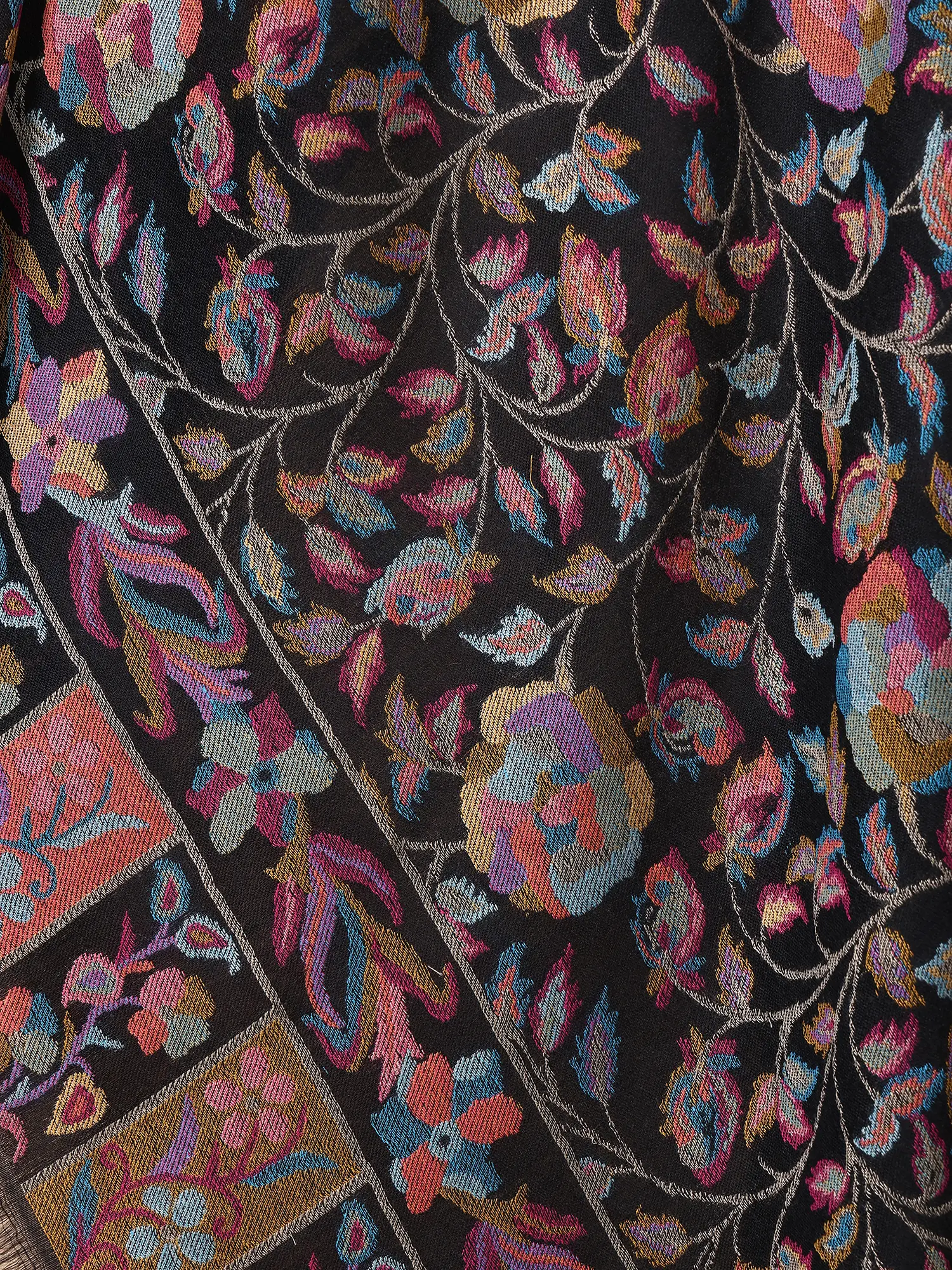 Phantom-Black Jamawar Shawl from Amritsar with Woven Multicolour Floral Vines And Paisleys