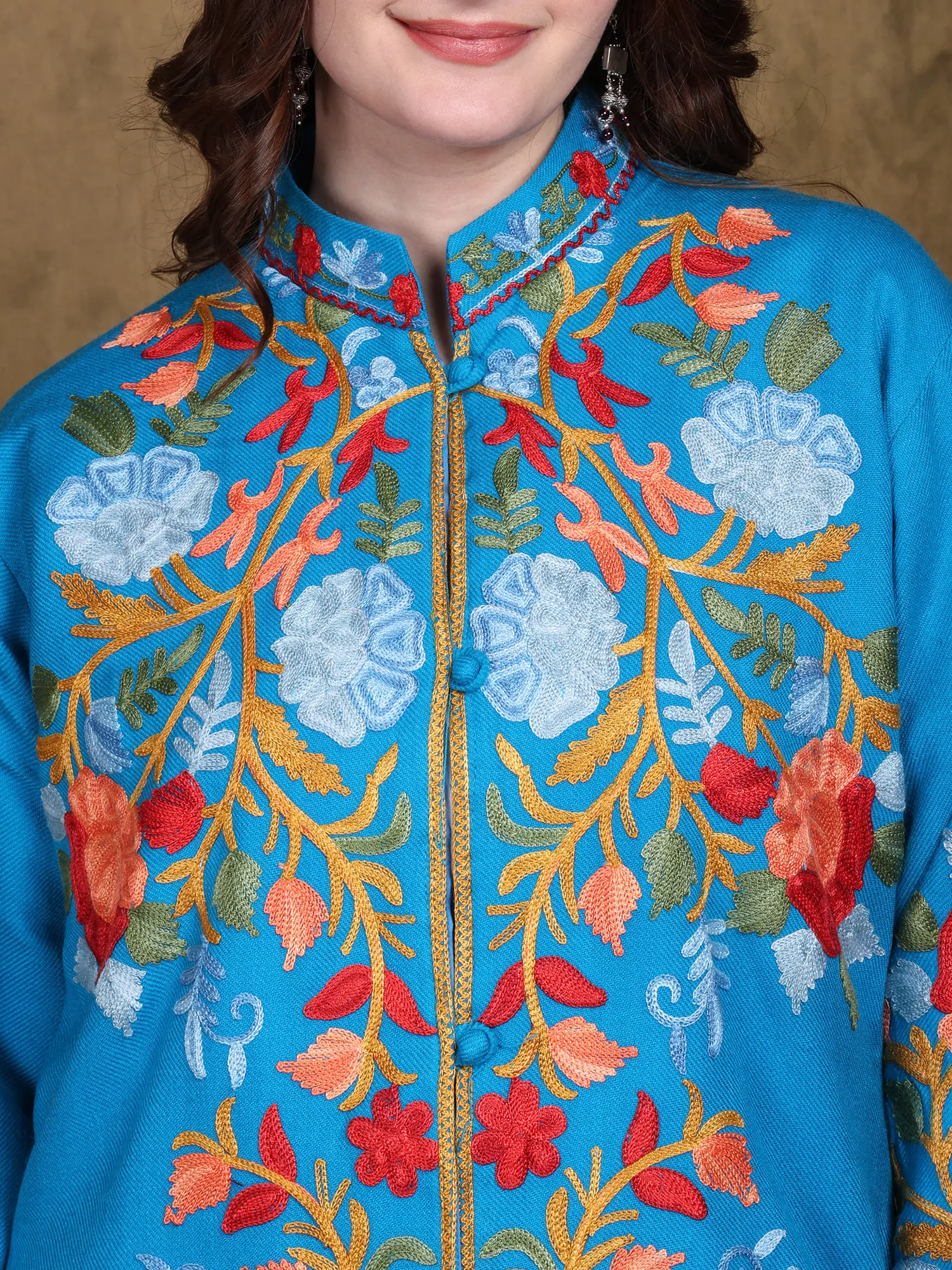 Rich Aari embroidery, using colorful threads creates blossoming details on the jacket, giving it a refreshing feel.
