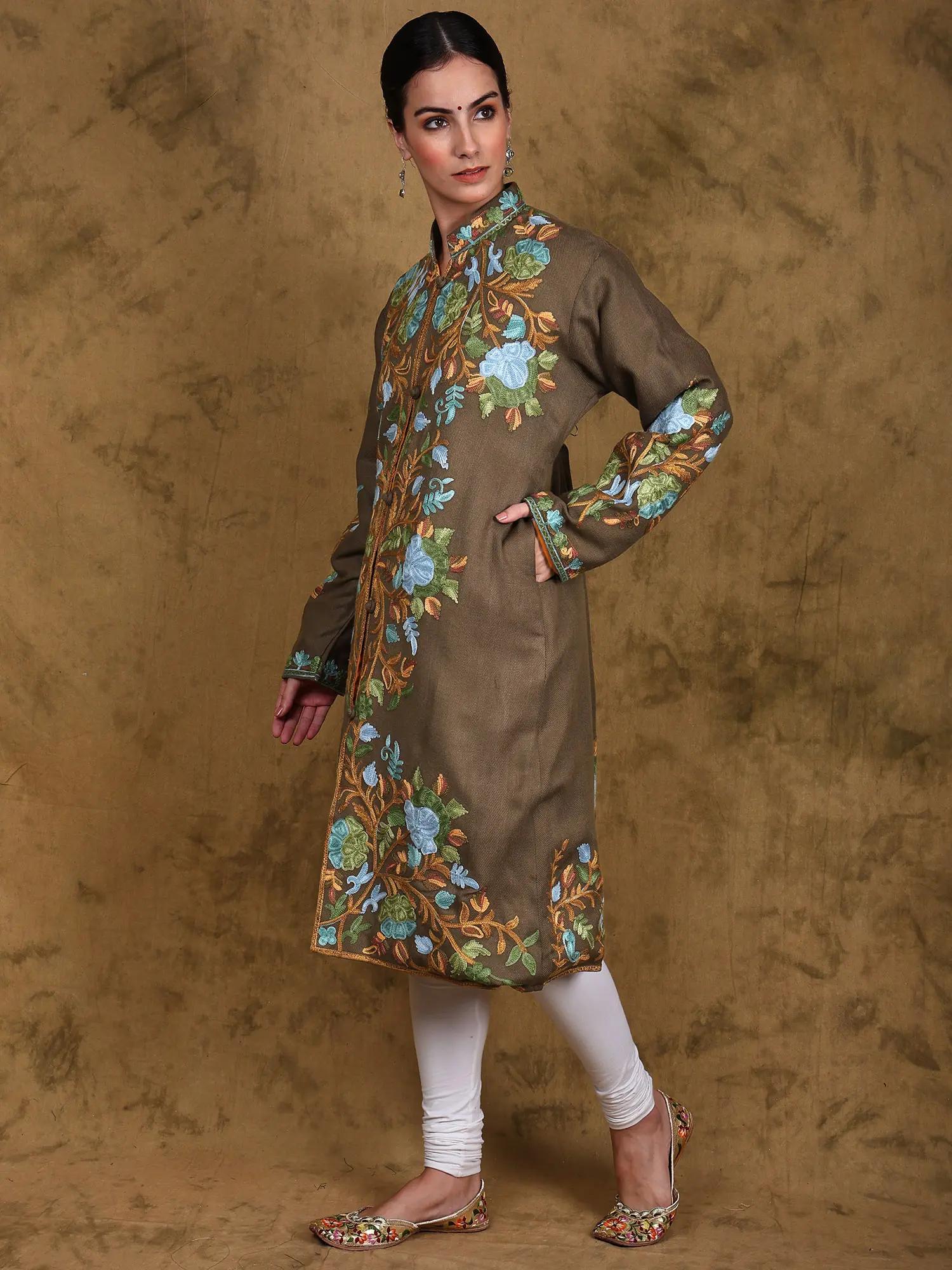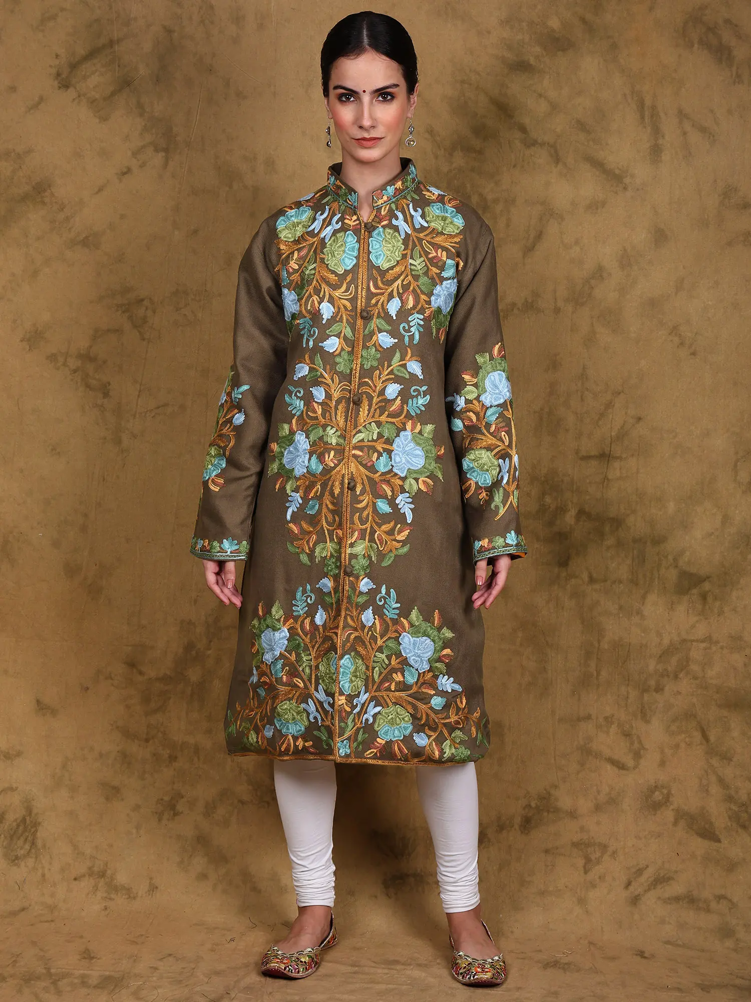 This long jacket is crafted with fine Kashmiri wool as a complete solution to all your winter fashion needs.