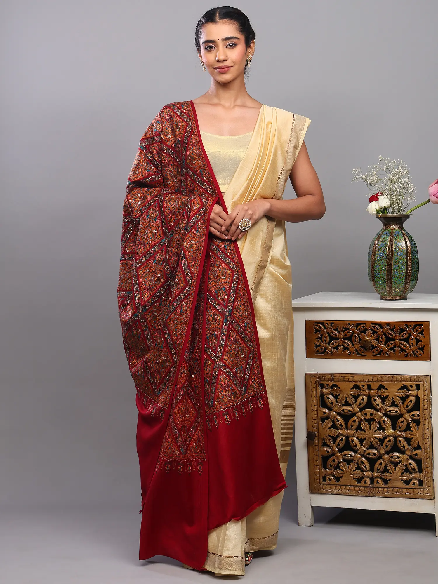 Woolen Detailed Multicolored Floral Jaal Pattern Fine Aari Embroidered Shawl from Kashmir