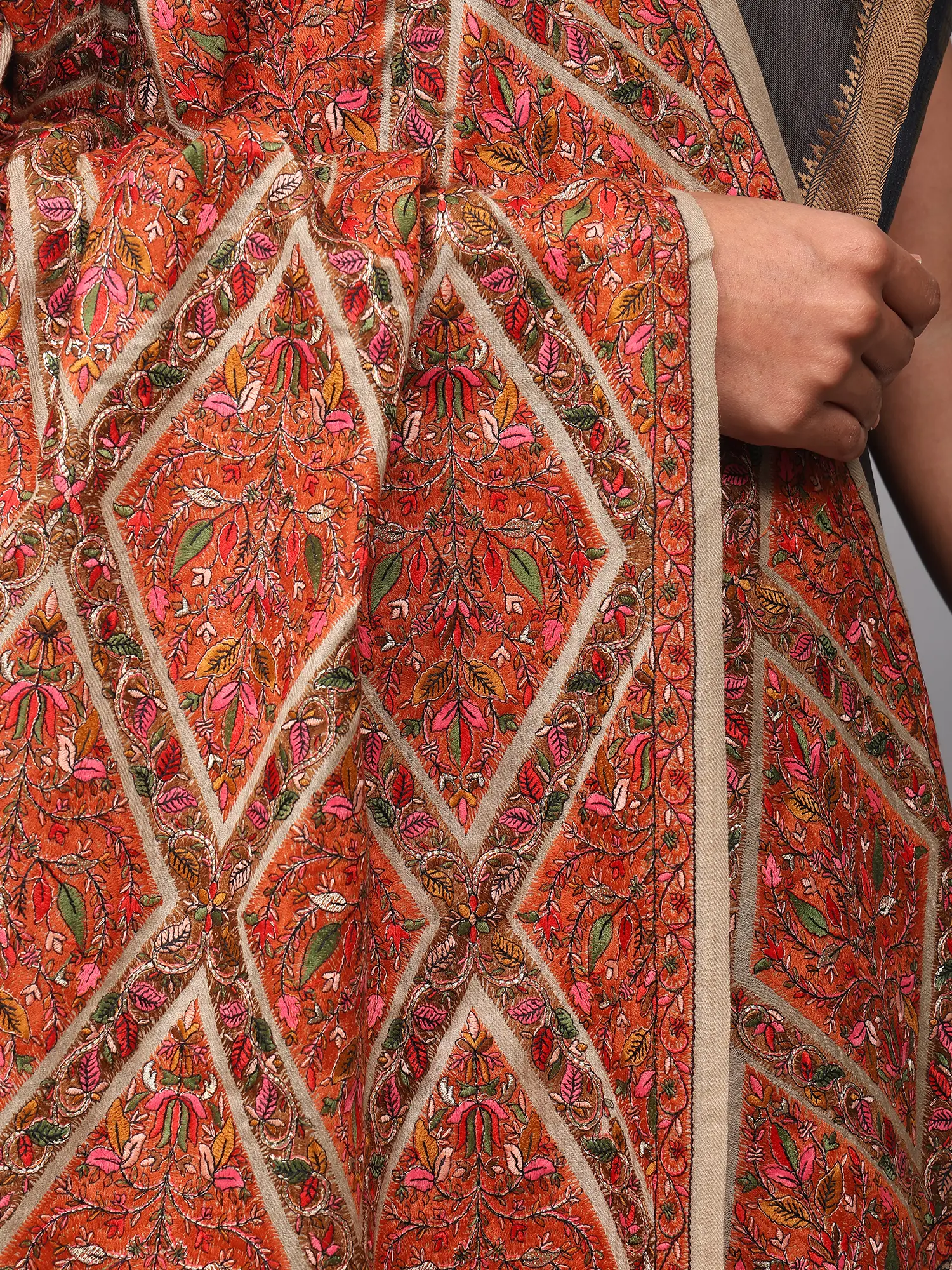 Woolen Detailed Multicolored Floral Jaal Pattern Fine Aari Embroidered Shawl from Kashmir