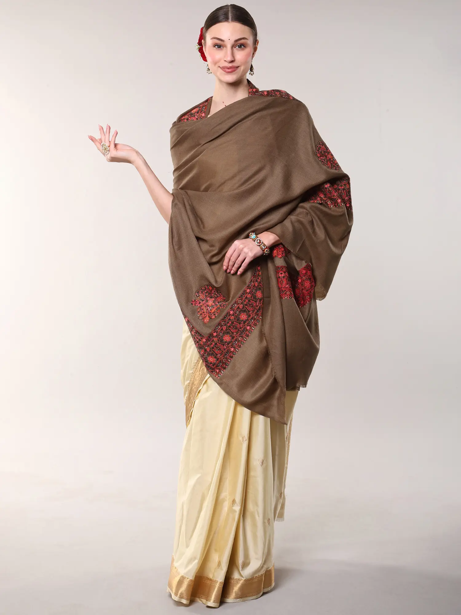 French-Oak Diamond Weaved Woolen Shawl with Sozni Embroidered Border