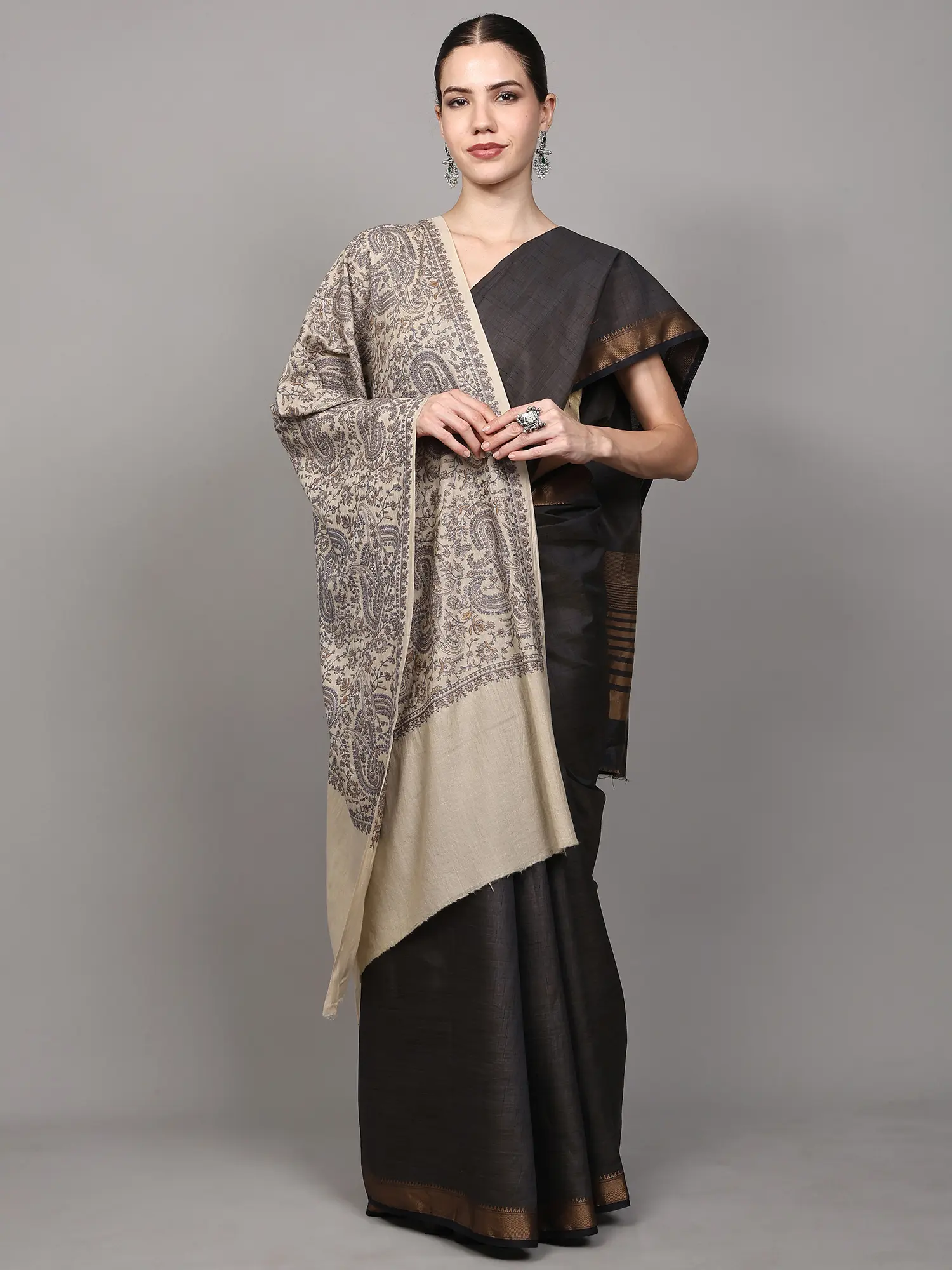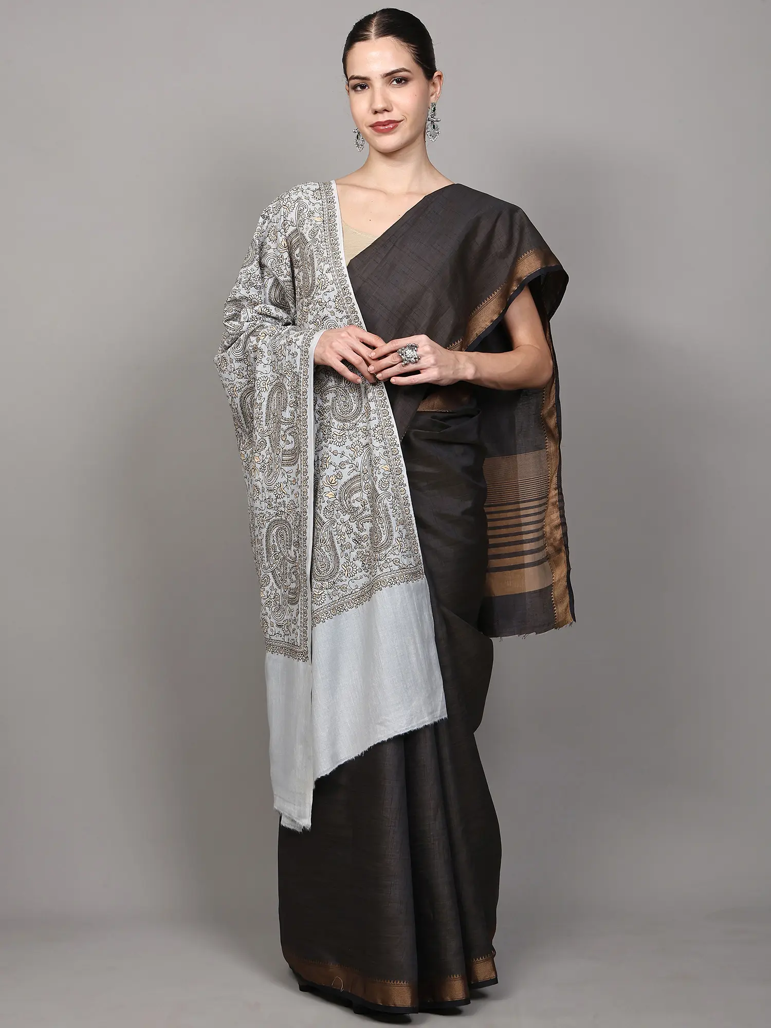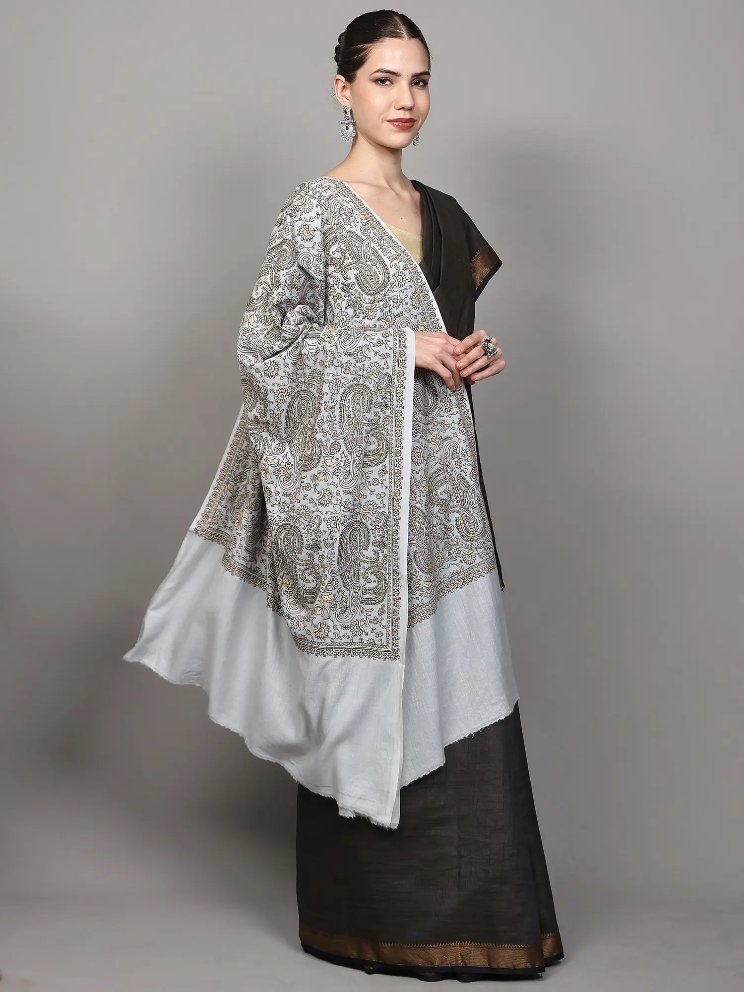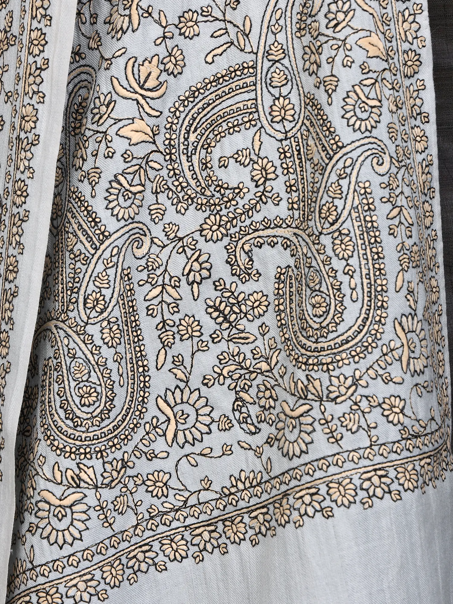 Wool Stole with Aari Embroidered Flowers and Paisleys from Amritsar