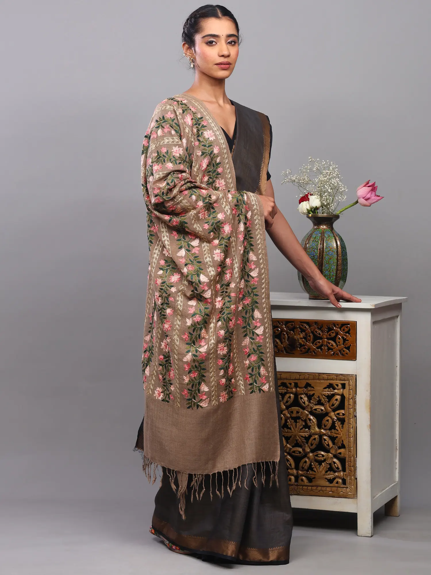 Wool Stole with Aari Embroidered Floral Vines in Multi-Color Thread from Punjab