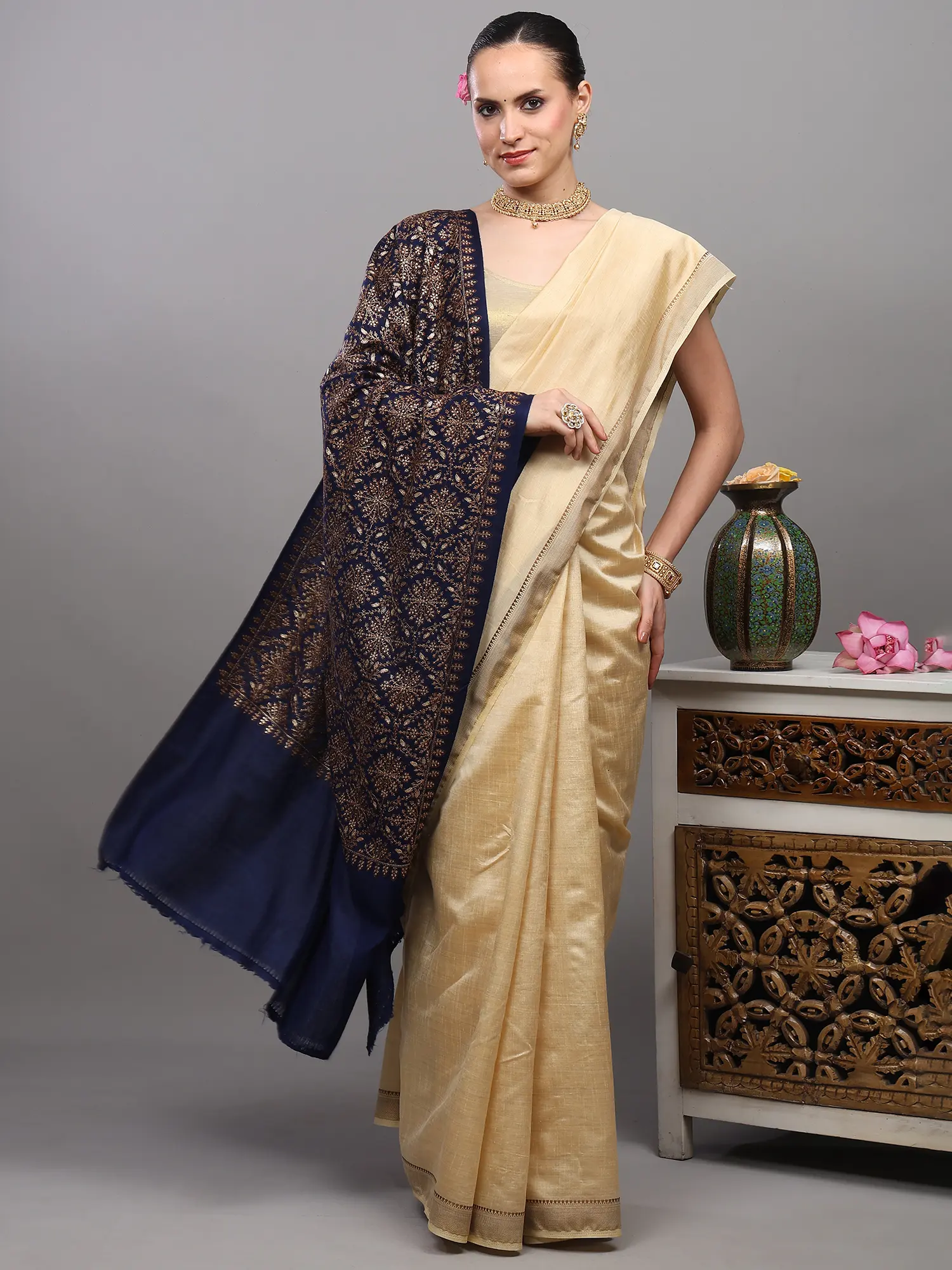 Dark-Blue Pure Pashmina Sozni Jamawar Embroidered Shawl