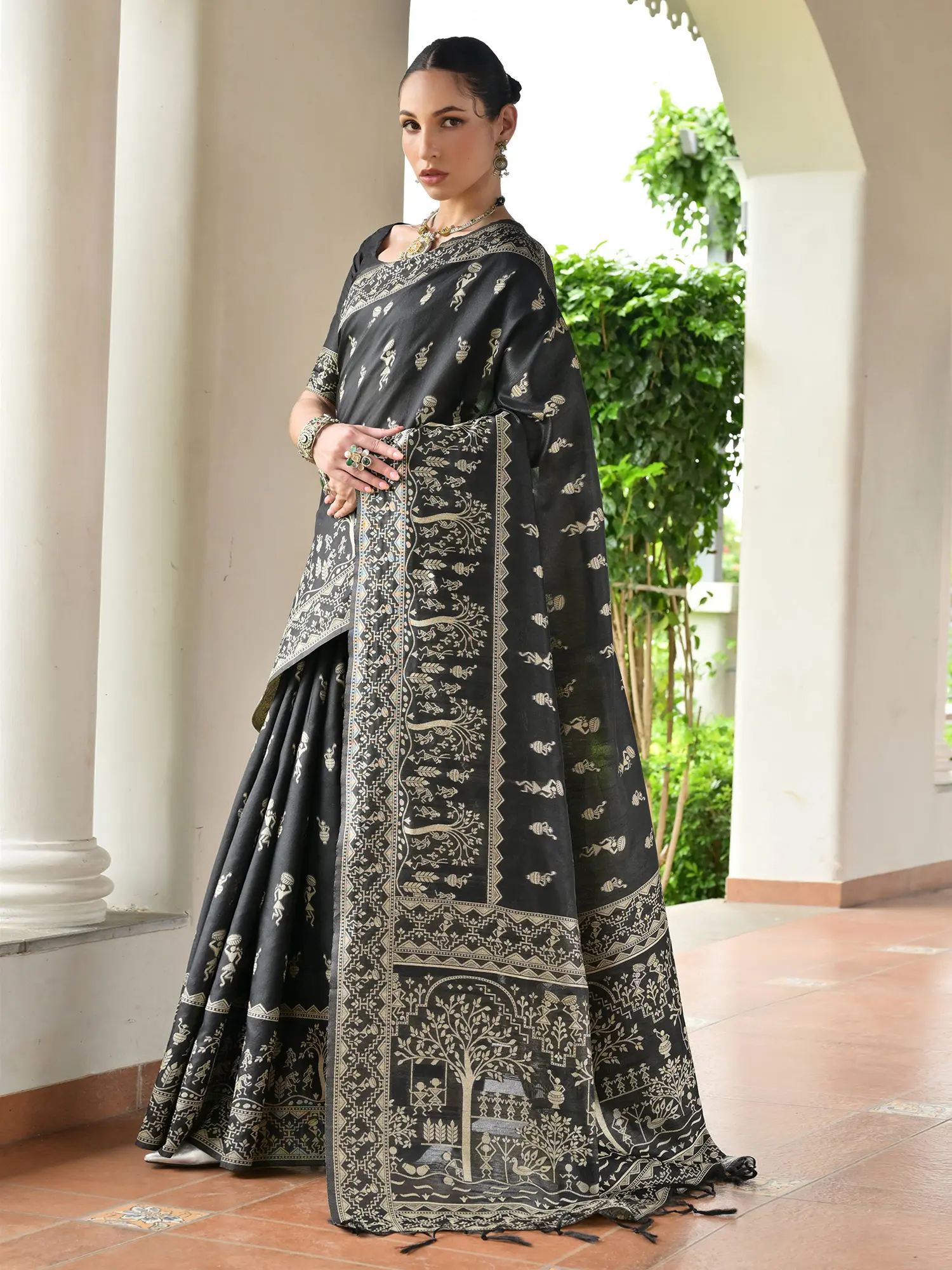Designed for festive wear, this saree is the epitome of ethnic charm and refined style. Whether you are attending a wedding, a traditional ceremony, or a grand cultural event, this saree promises to make a memorable statement. Pair it with traditional gold jewelry and complementary accessories to complete a look that is both classic and contemporary. The versatility of the black base allows for a wide range of jewelry choices, enabling you to personalize your ensemble and express your unique sense of style. Embrace the spirit of celebration with this magnificent woven wonder, and let its timeless beauty illuminate your special moments.