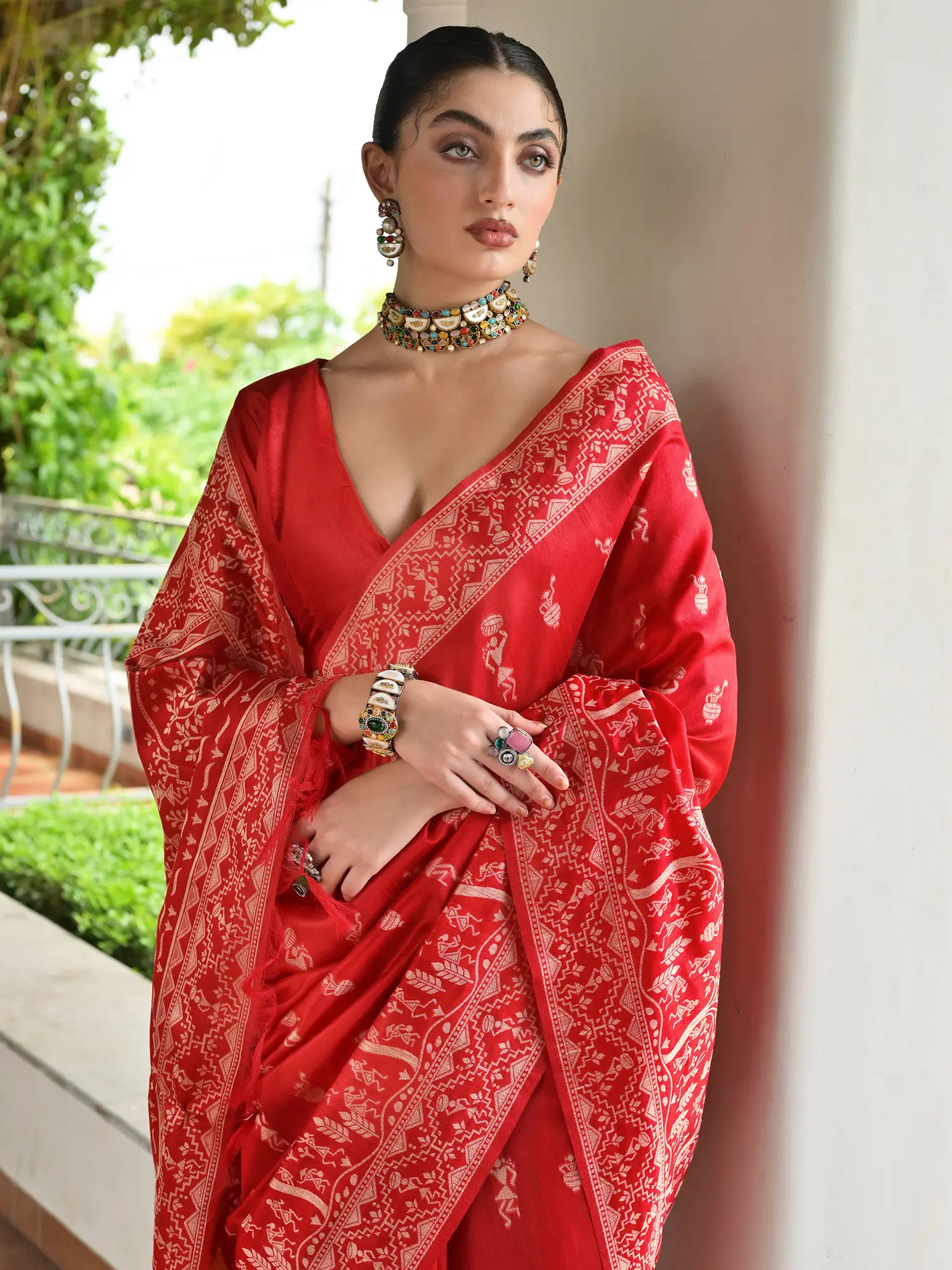 Art Silk Saree with Warli Folk Figures Printed Border and Pallu