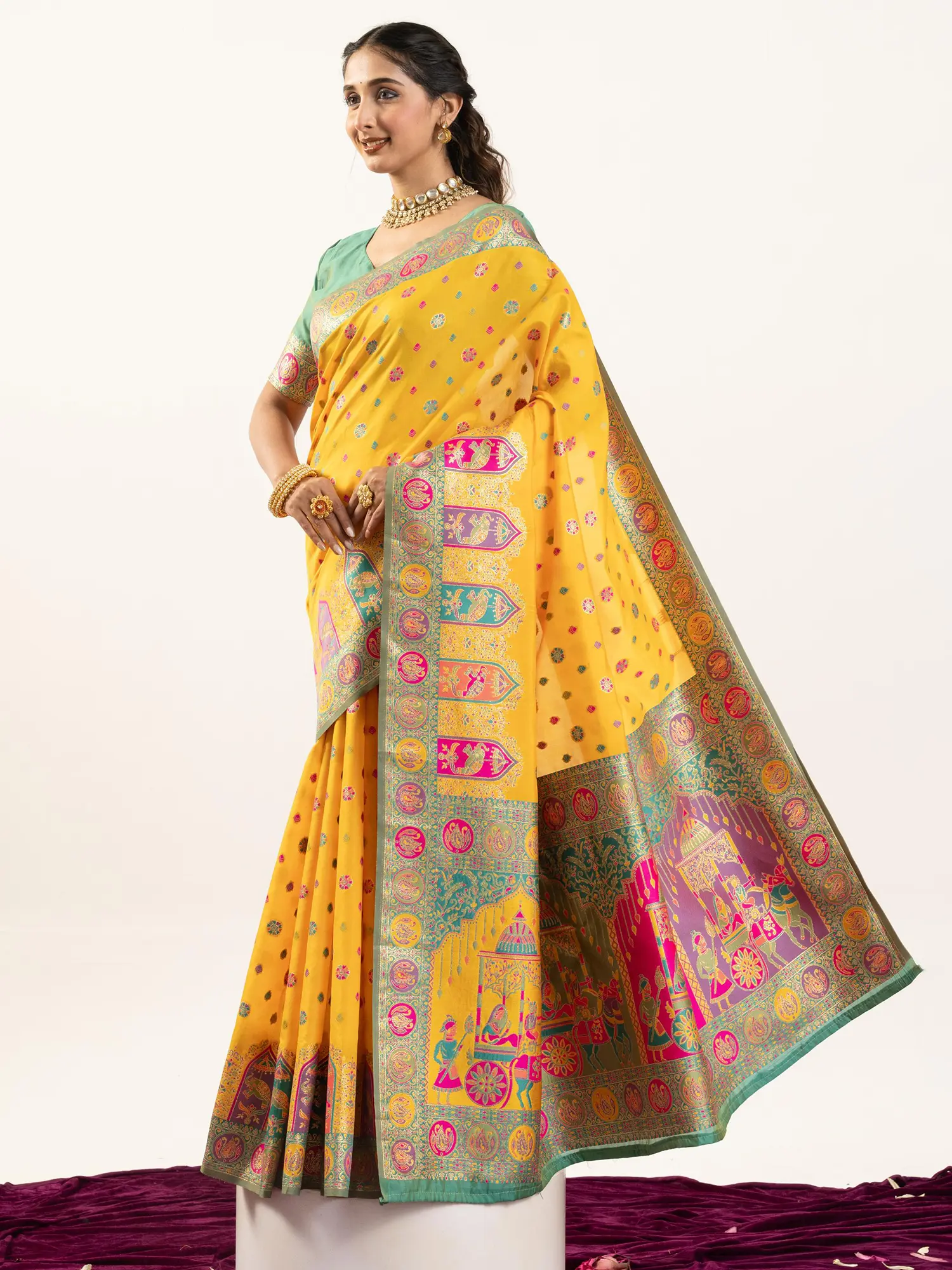 Features intricate Meenakari work on the borders and pallu, showcasing vibrant, multi-colored motifs.