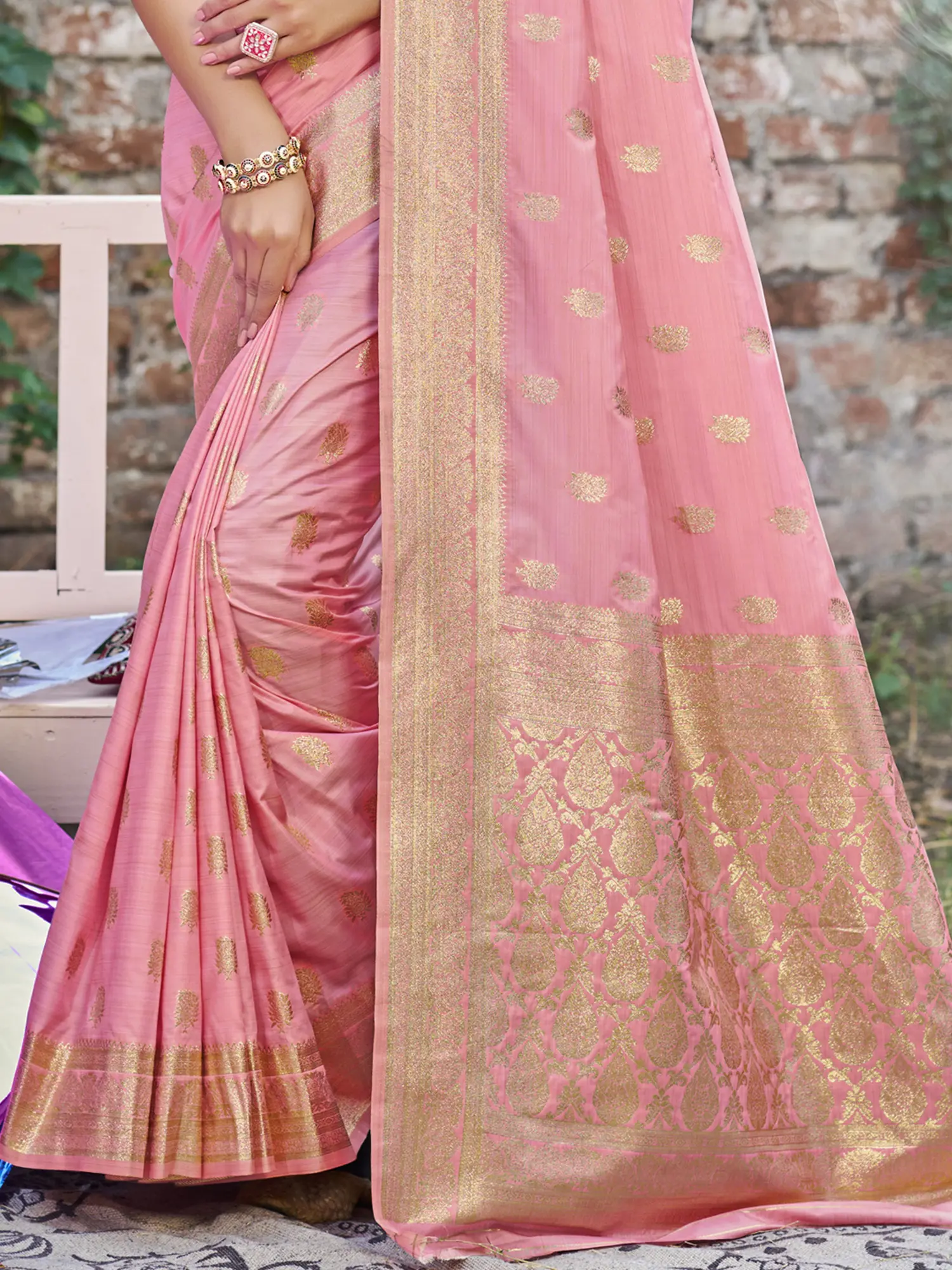 The soft, flowing silk drapes gracefully, enhancing your silhouette and adding to the overall elegance of the ensemble. The luxurious texture of the silk is a delight to the touch, providing comfort and a sense of opulence. The subtle sheen of the fabric catches the light beautifully, adding a touch of glamour to your look. The combination of the lavender base and the golden motifs creates a captivating contrast that will effortlessly elevate your style.