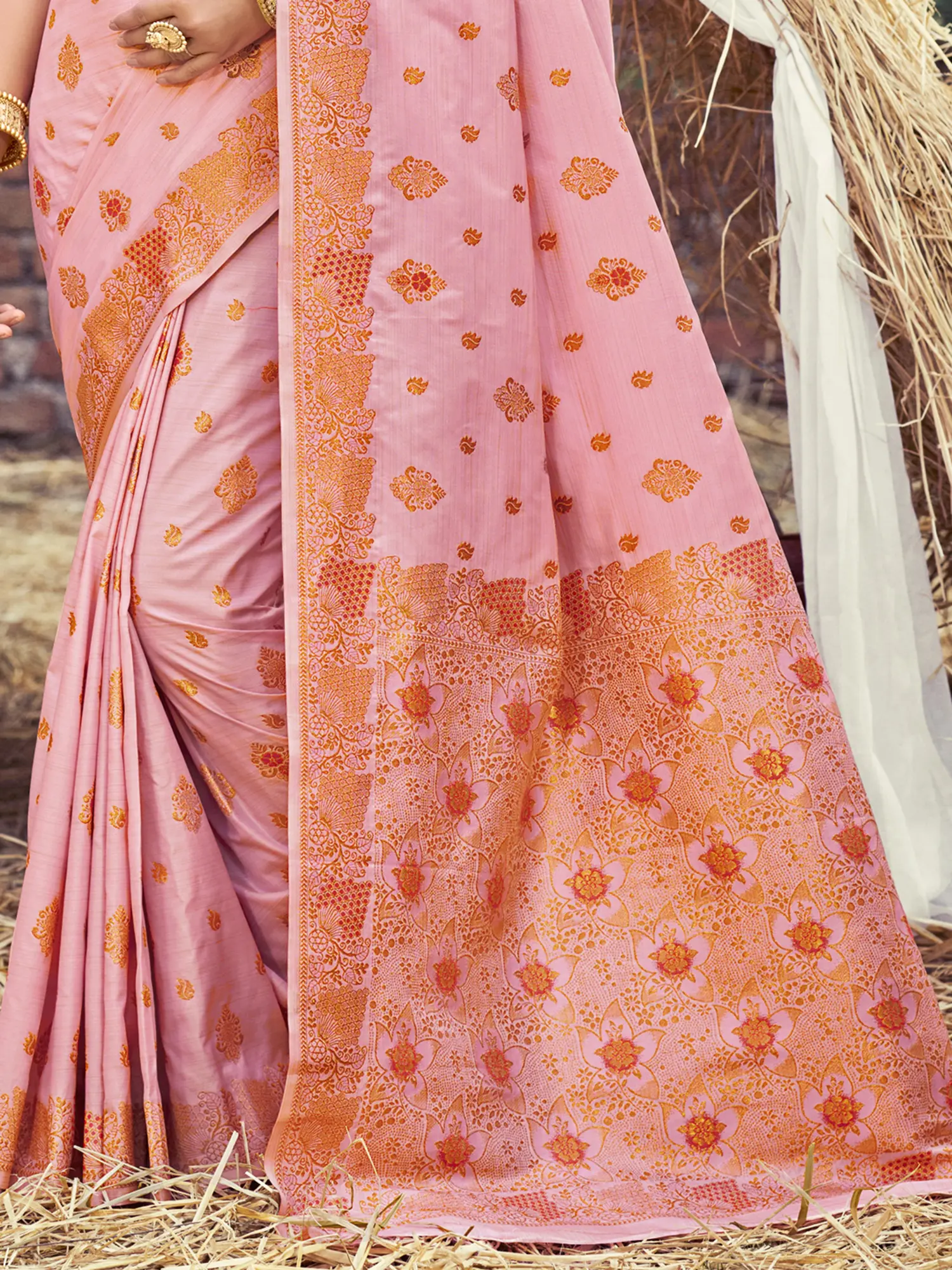 The striking contrast pallu elevates this saree to a new level of sophistication. The contrasting color palette creates a dramatic and eye-catching effect that beautifully frames the wearer. The intricate weaving work on the pallu complements the motifs on the body, adding a touch of opulence. The detailed design and the contrasting hues come together to create a stunning focal point.
