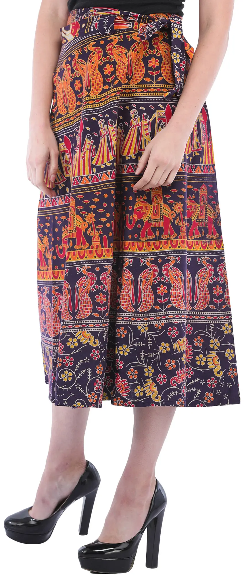 Designed for ultimate versatility and comfort, this skirt features a flattering wrap-around style that ensures a perfect fit for a variety of body types. The generous waistband allows for adjustable sizing, providing both ease of wear and a comfortable, secure fit. The lightweight pure cotton fabric drapes beautifully, offering a breezy feel that is ideal for warmer weather or for creating a bohemian-inspired layered look. Whether you're heading to a casual brunch, a summer festival, or a cultural event, this skirt offers a unique blend of comfort, style, and a deep connection to artisanal heritage. Its vibrant hues and captivating print make it a standout piece in any wardrobe, promising to bring a touch of global flair and artistic appreciation to your everyday ensembles.