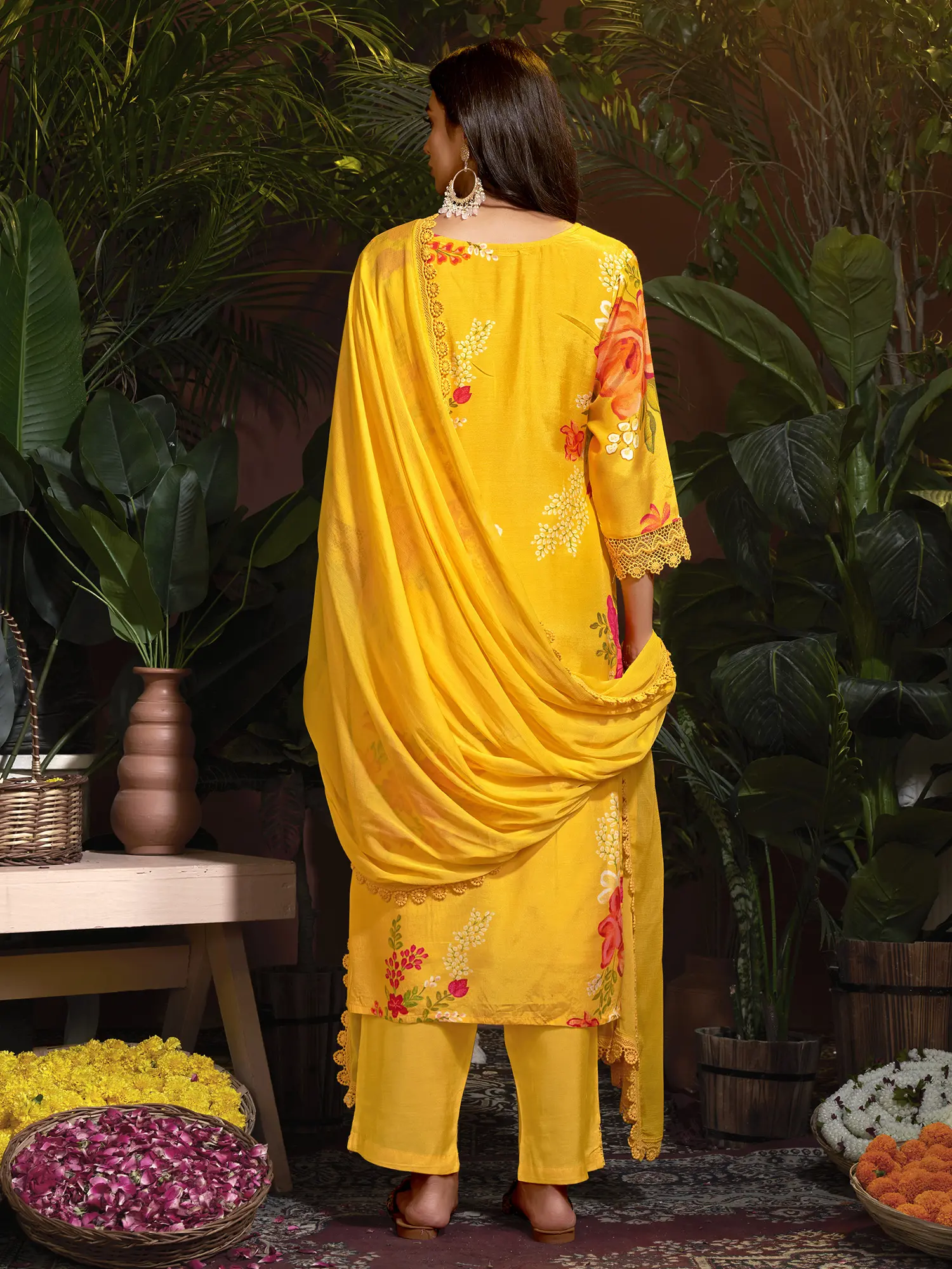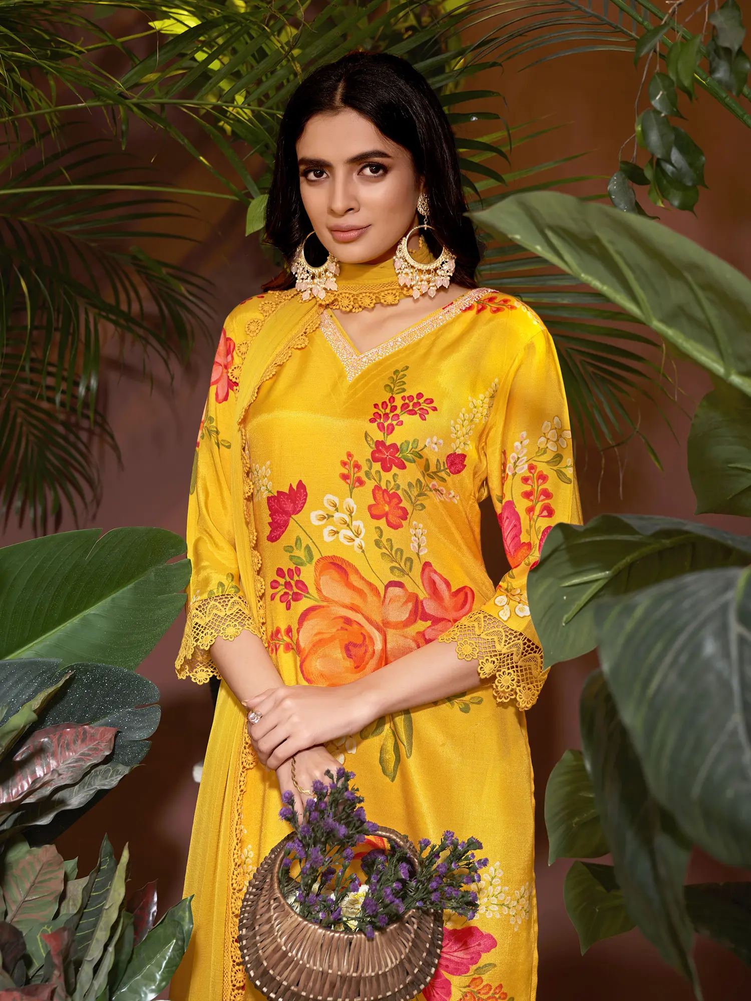 Glow with an effortless style dressed in this yellow-orange printed suit set.