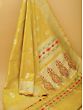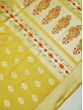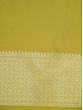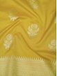 Butas of Banaras and patterns from Patan patola textiles are combined on the canvas of this Katan silk Banarasi sari, which is graceful yet alluring. The yellow shade used on the field of the sari is a soft tone, beautified with the Mugha butis done in fine Zari threads. The aesthetics of the sari bloom on the pallu, where traditional Gujarati motifs are woven into the Katan silk backdrop with supple Resham threads in awesome colors. The border of the sari showcases a symmetrical use of square and floral designs, borrowed from the field of traditional Banarasi saris.