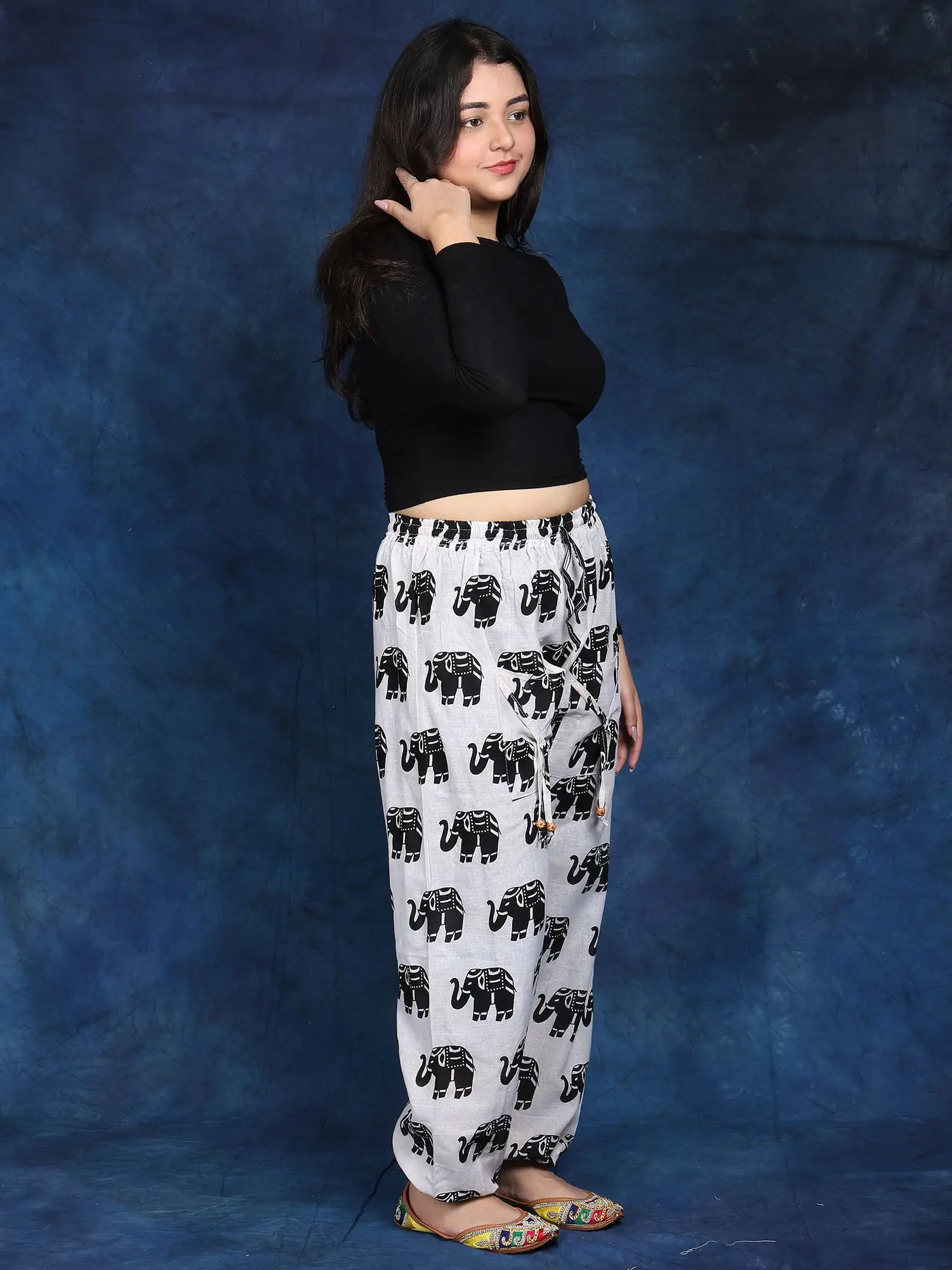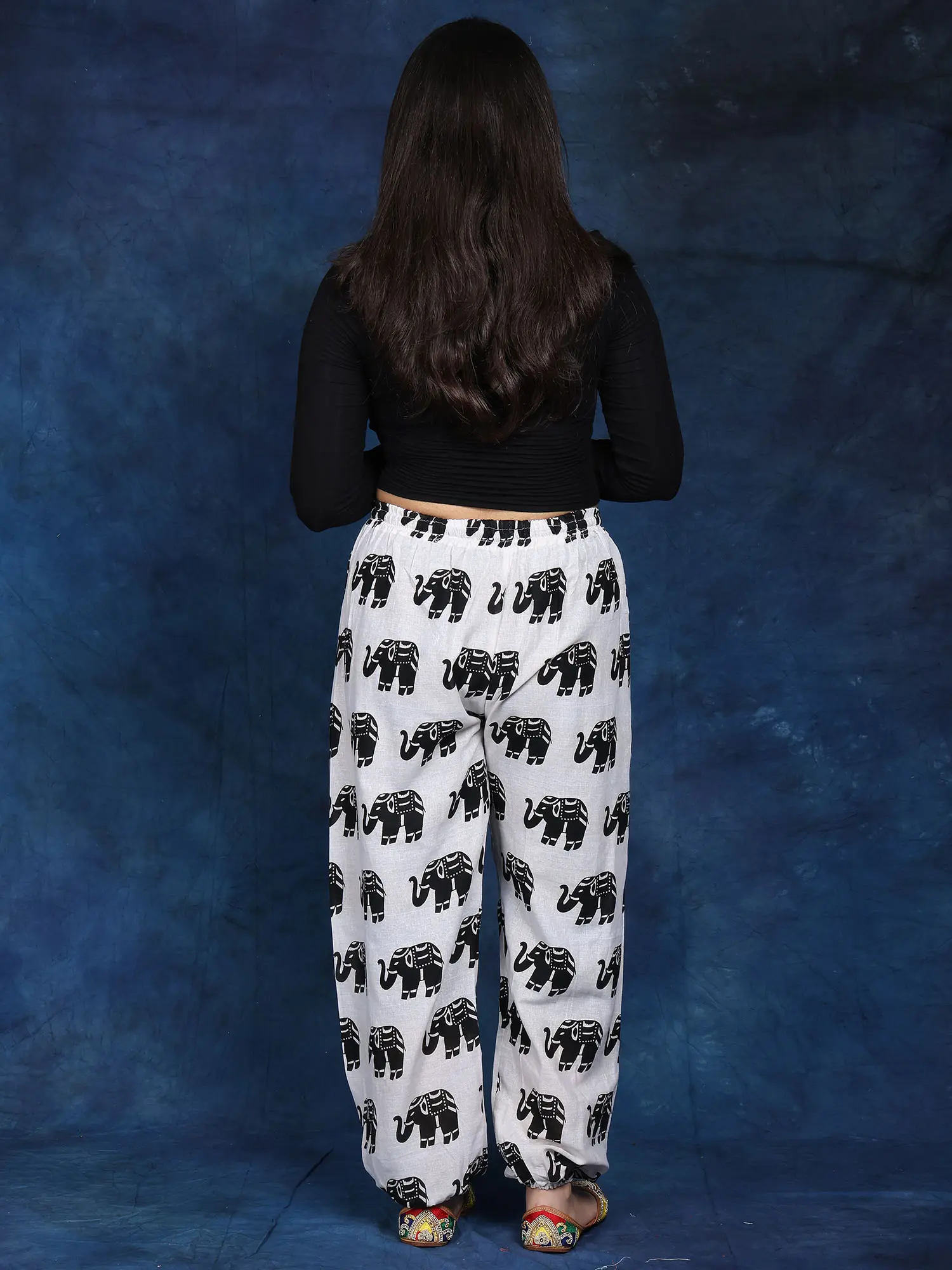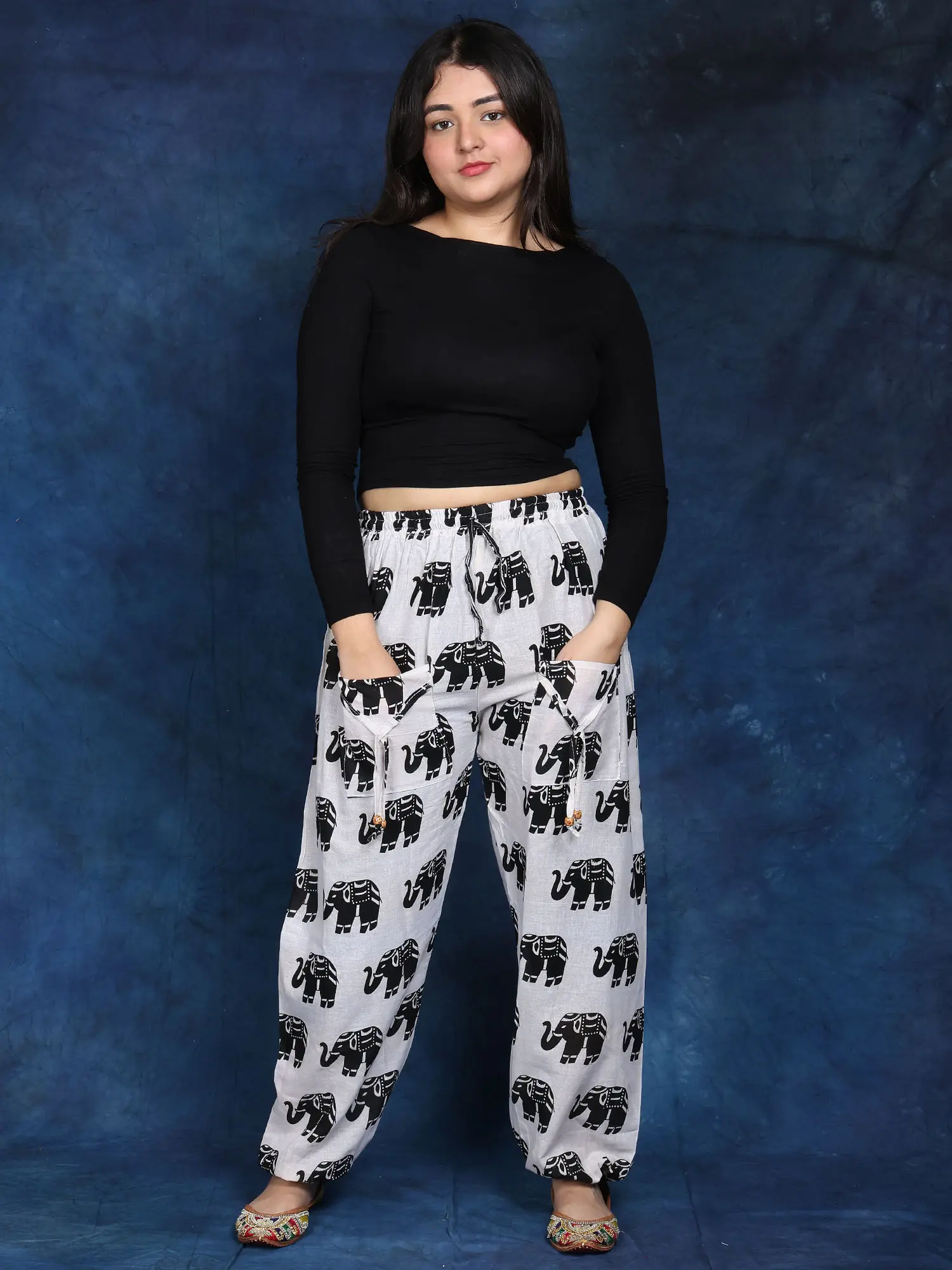 Adorning these trousers is a delightful pattern of black elephants, meticulously printed against a crisp white backdrop. This whimsical design adds a unique and eye-catching element to your wardrobe, exuding a sense of joy and individuality. The elephants are depicted with a charming simplicity, creating a subtle yet impactful statement that is sure to garner compliments. This print is perfect for those who appreciate globally-inspired aesthetics and a touch of fun in their attire. ––––––––––