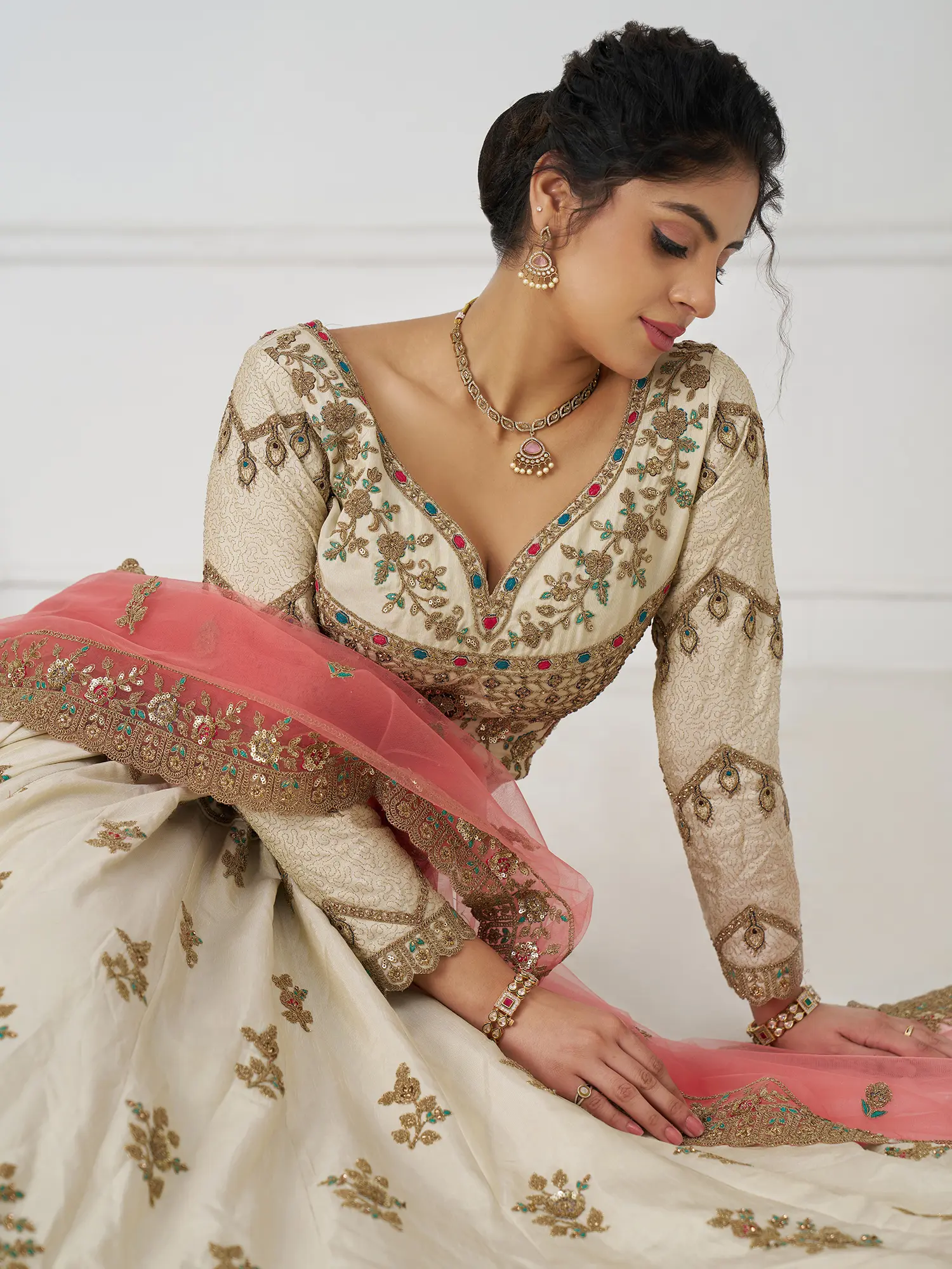 Dark-Cream Premium Heavy Net Classical Dancer Girl Motif Lehenga Choli With Multi Thread, Zari, Diamond Embroidery And Maroon Dupatta