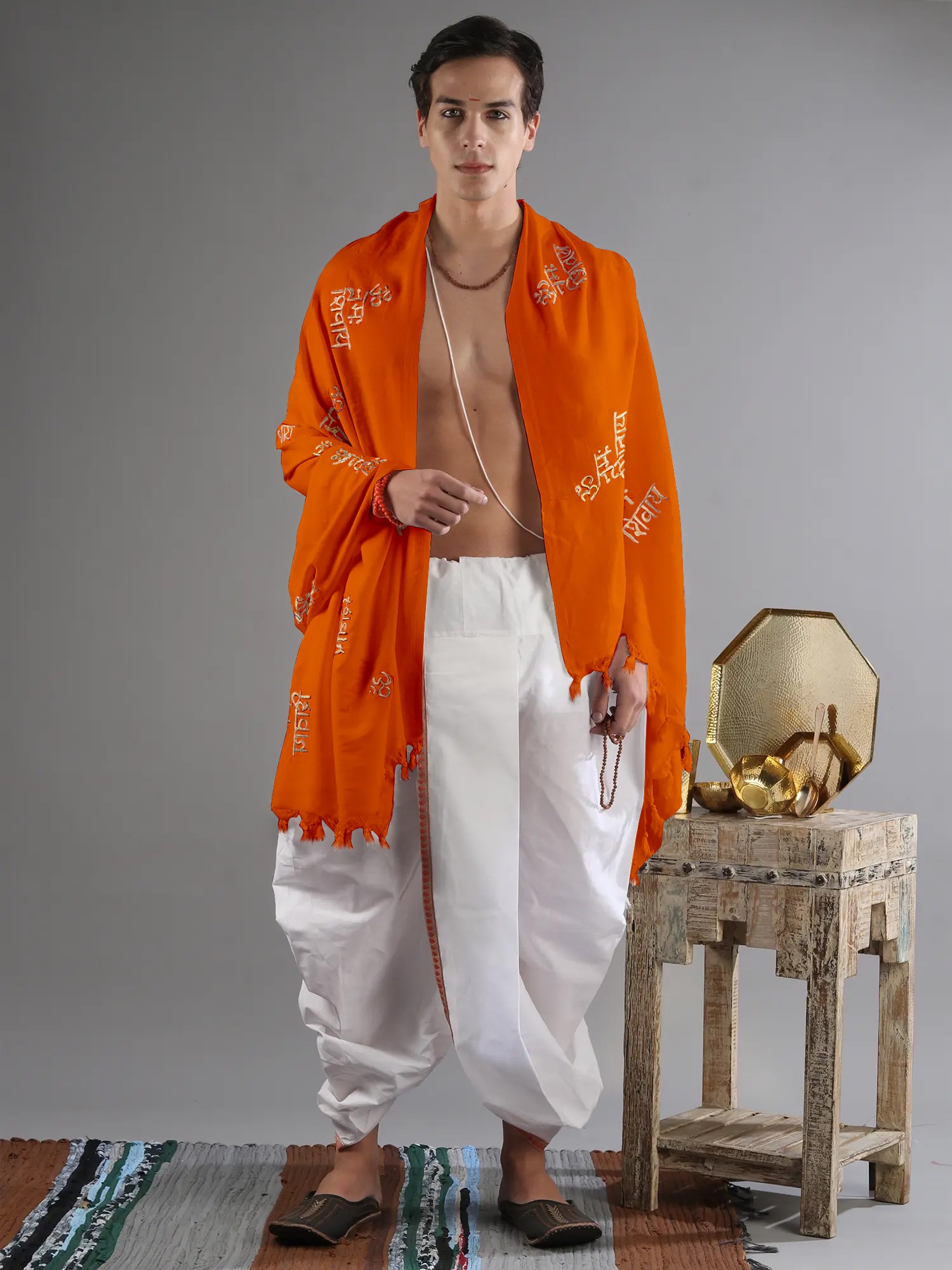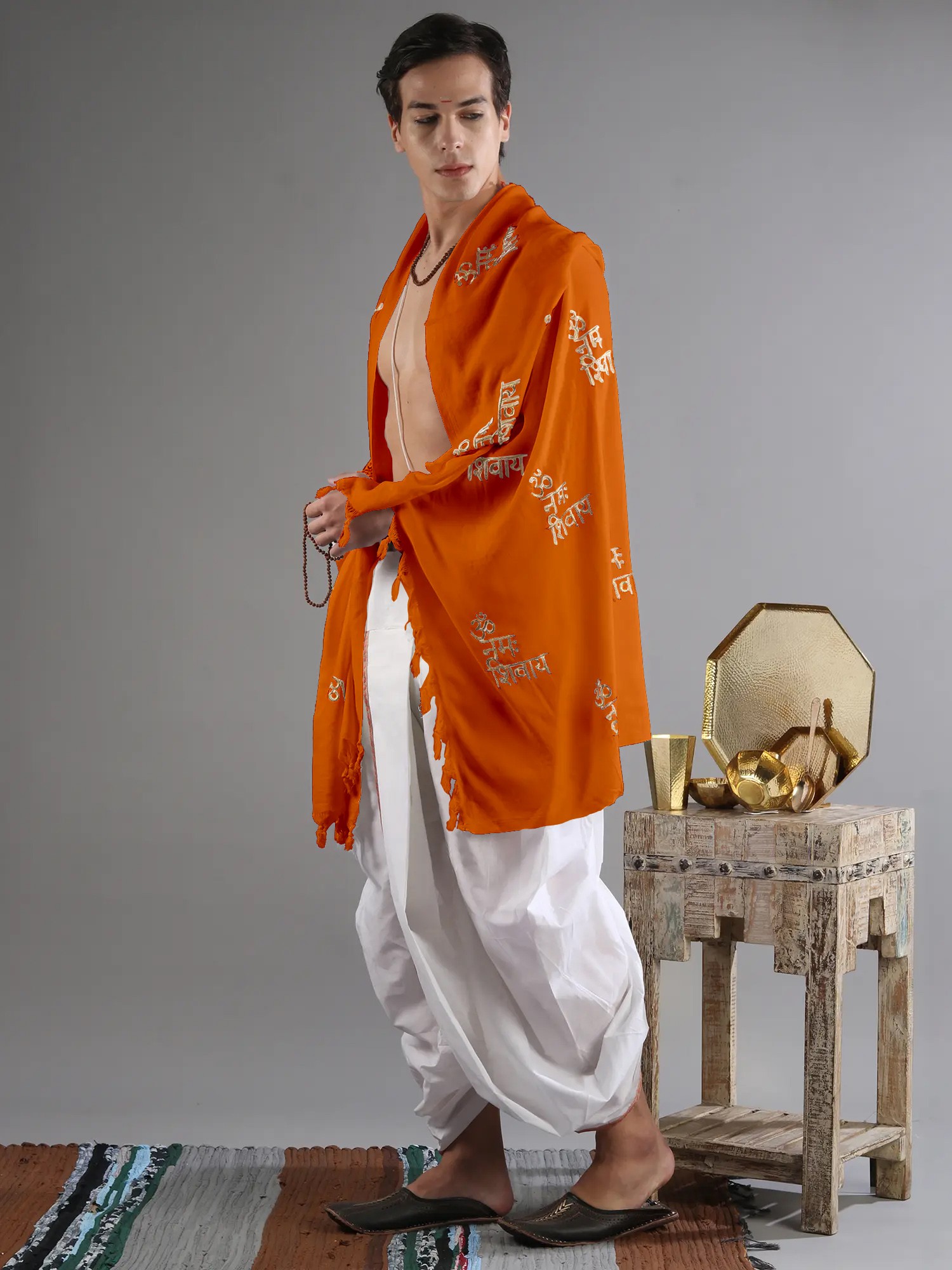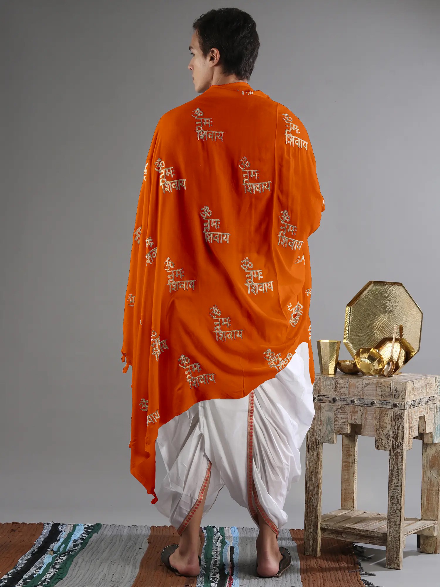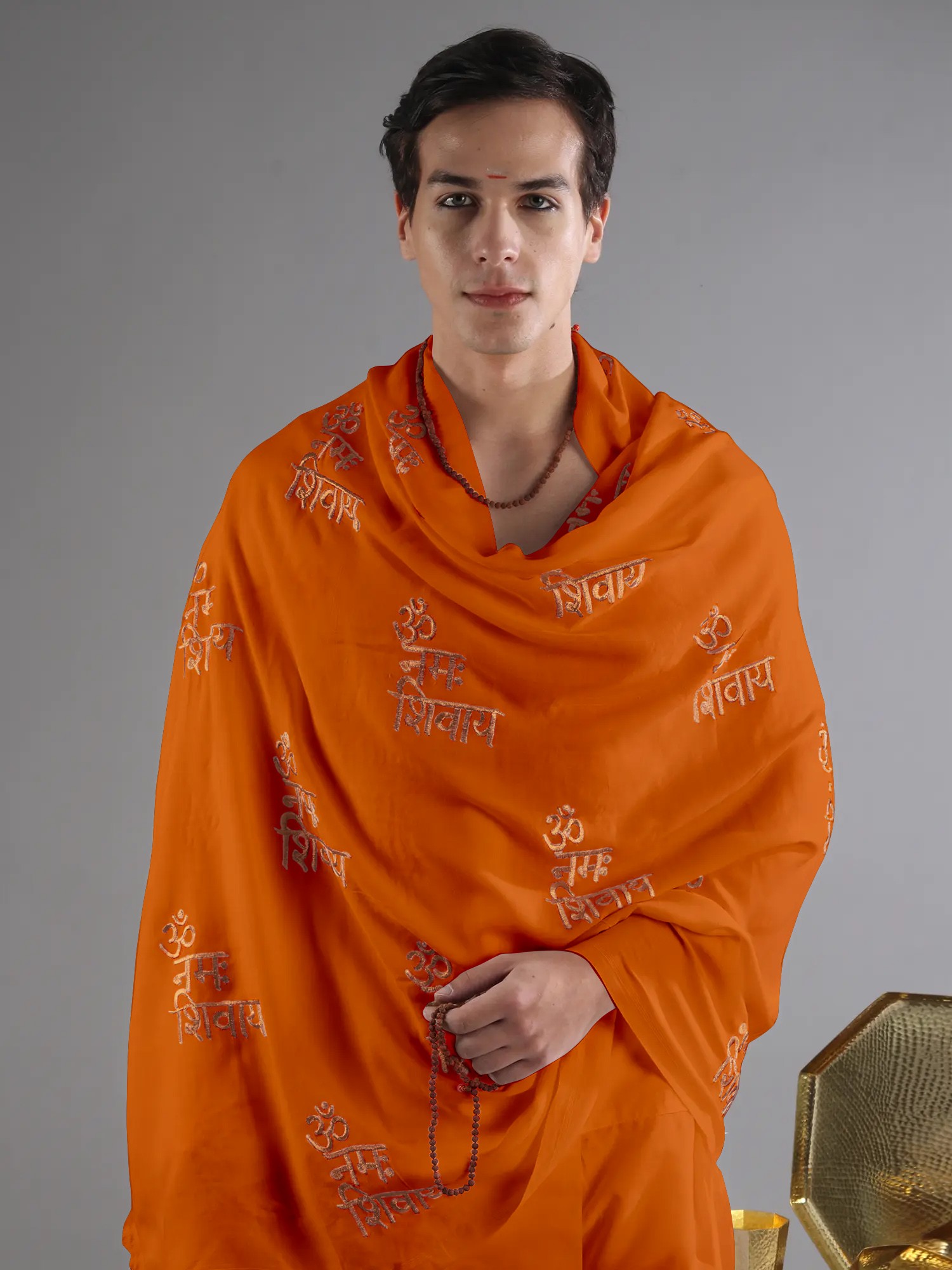 This Zari Embroidered Om Namah Shivay Prayer Shawl is a dedication to the Lord of the Universe. This prayer shawl allows the devotee to present humble salutations to Lord Mahesvara, who wears a garland of serpents around His neck, has three eyes, and is coated in ash (vibhuti). He is everlasting, pure, and wears the entire sky as His clothing. He is embodied as the initial letter Na. The Shawl is made of polycotton and carries a pristine white color that resembles the description of the snow-clad Kailash mountains, the abode of Lord Shiva.