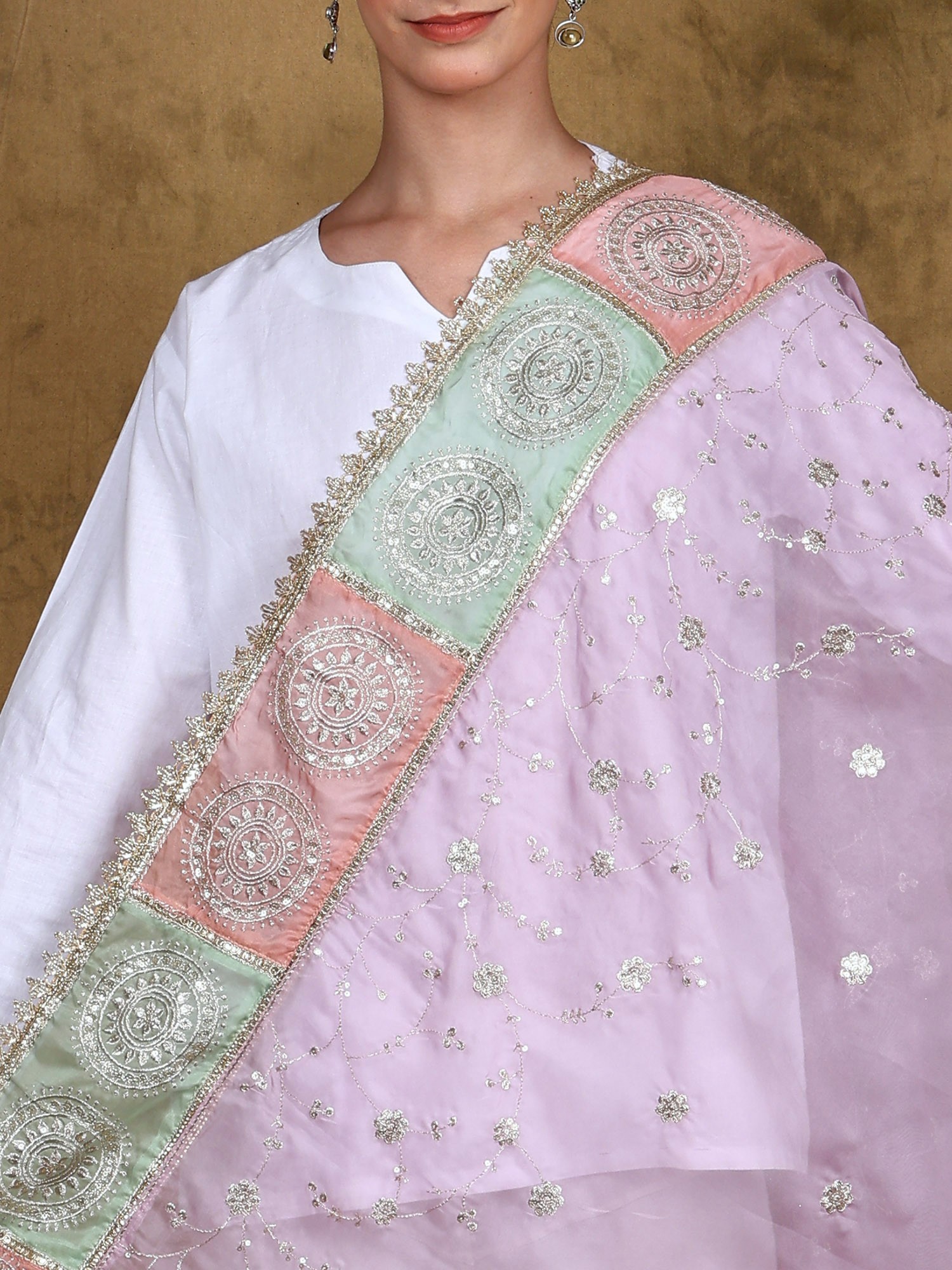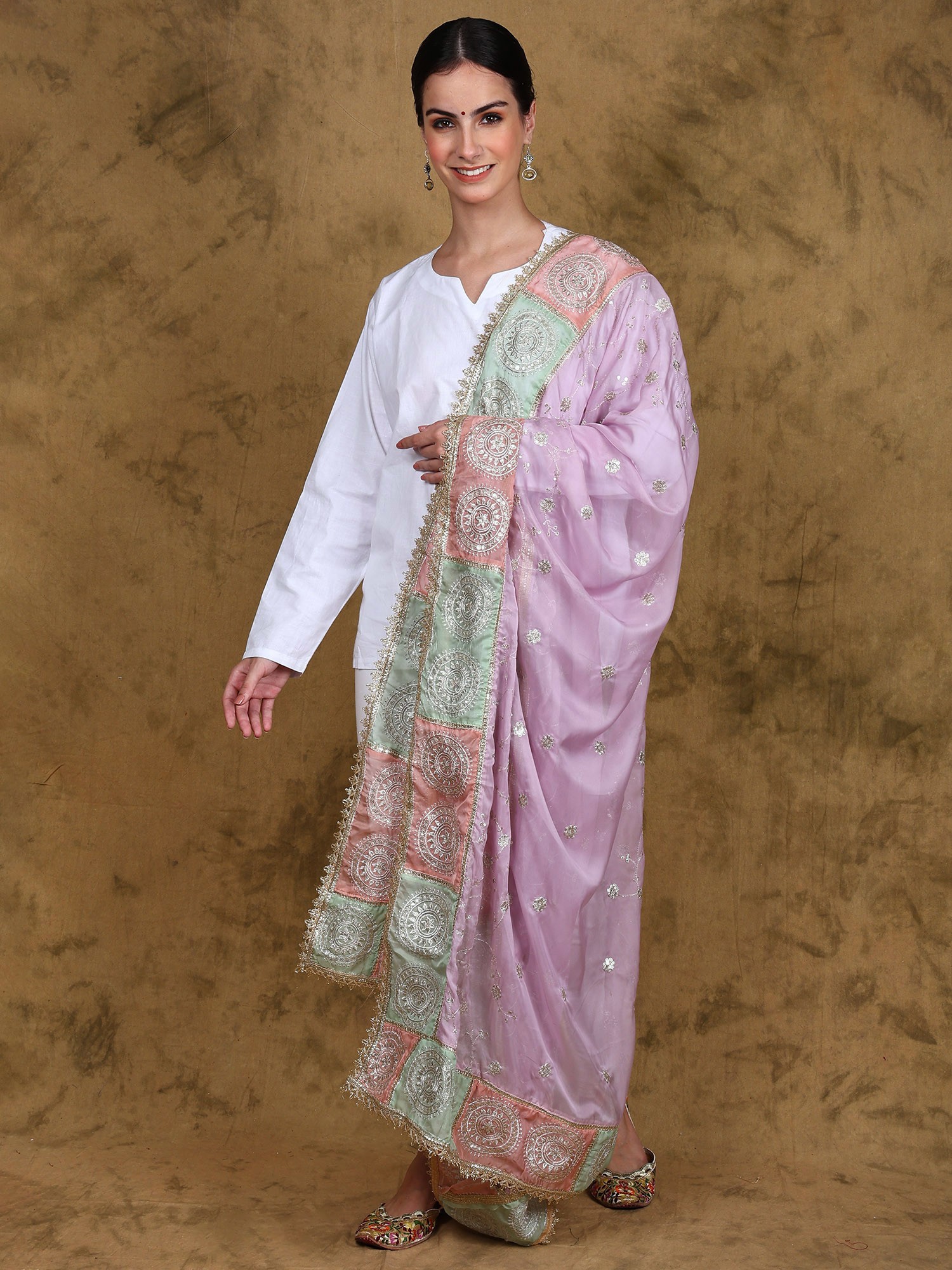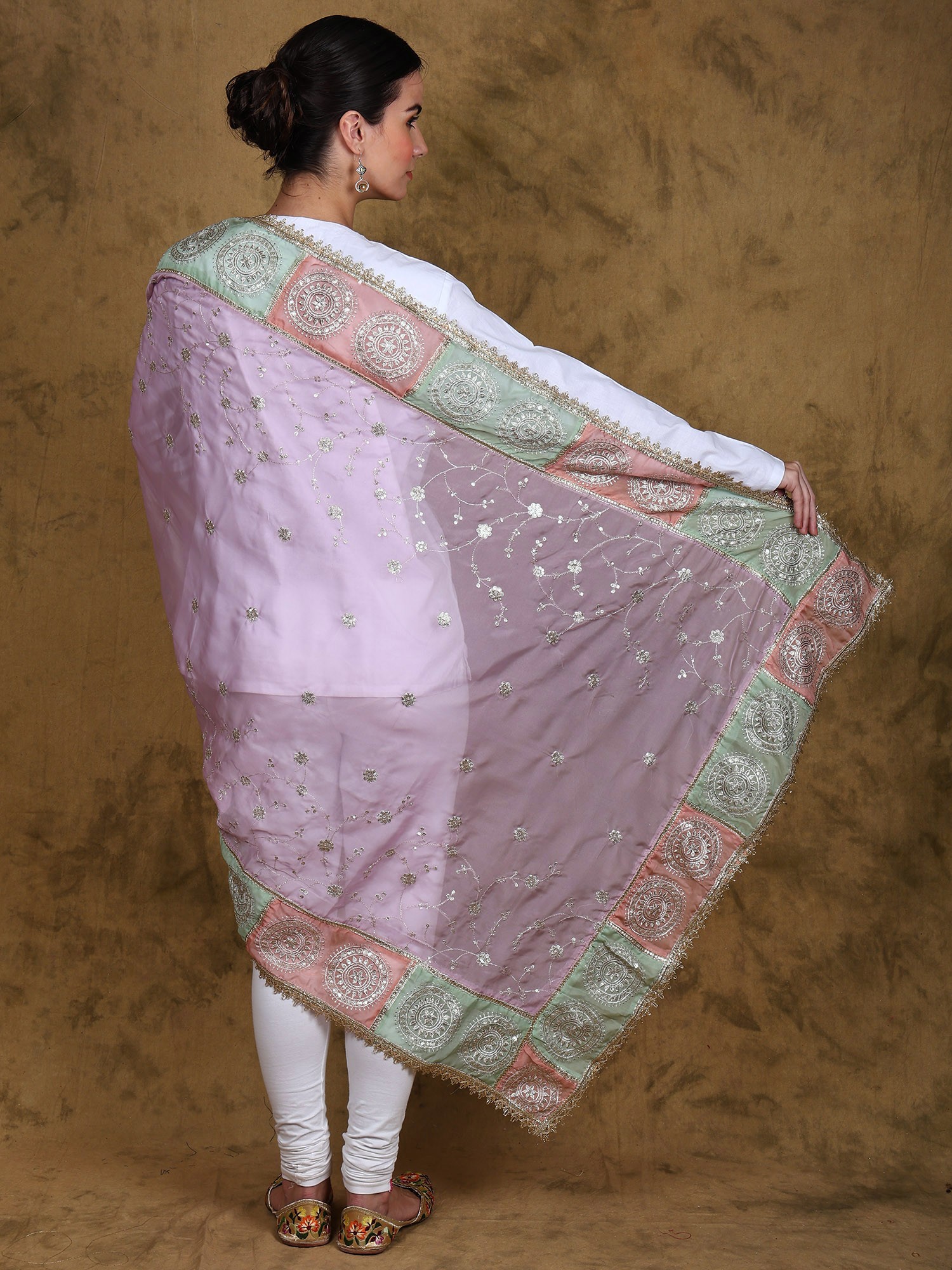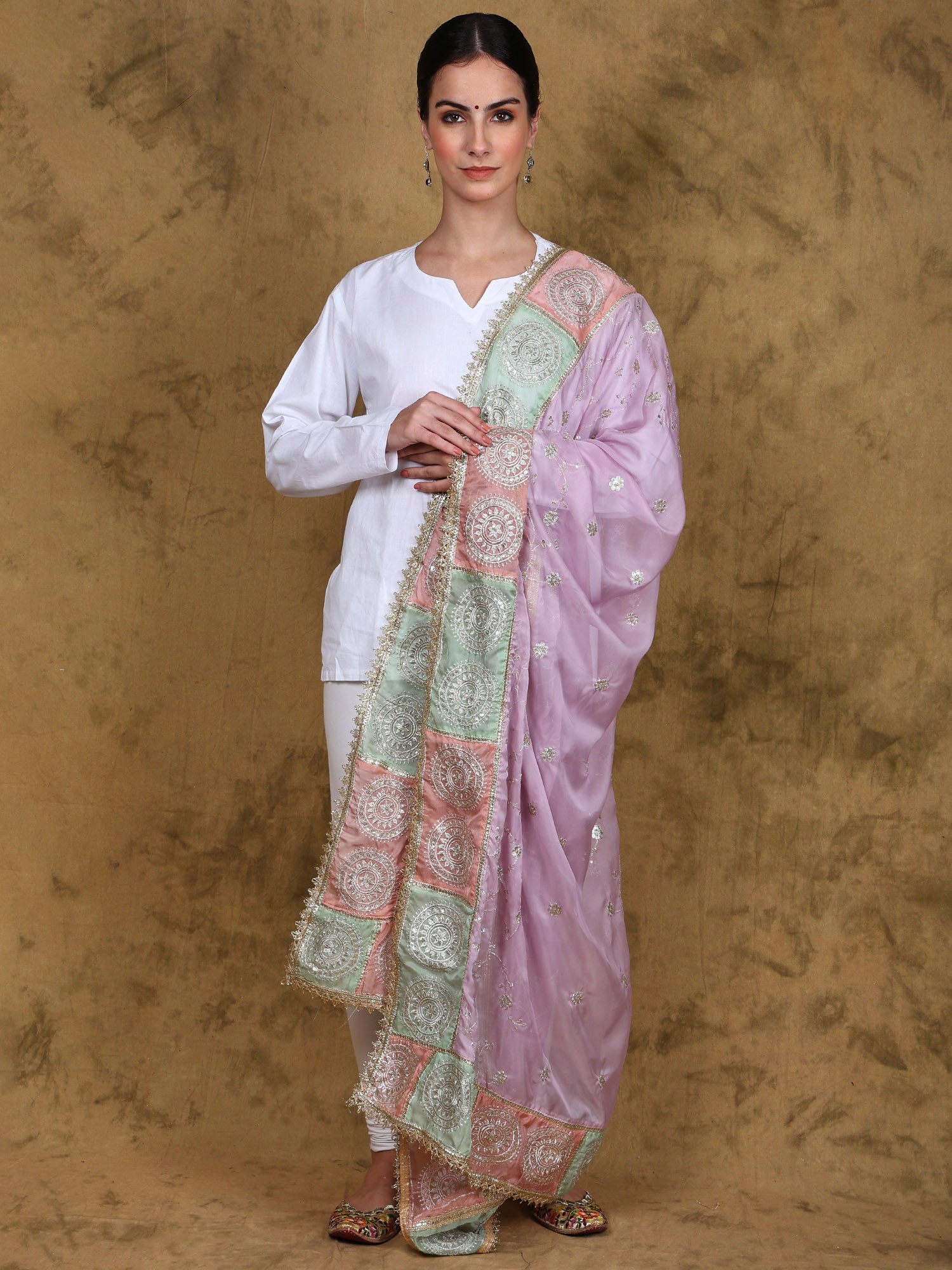 The beauty of this dupatta lies in its exquisite Zari Gota Patti embroidery. Zari, the shimmering gold thread, and Gota Patti, the delicate ribbon embellishment, are expertly interwoven to create a mesmerizing pattern. The vibrant colors of the pastel pink, mint green and silver against the soft lavender base create a stunning visual spectacle. Each chakra motif is a testament to the dedication and precision of the artisans, resulting in a truly unique and unforgettable piece. This intricate detailing is what truly sets this dupatta apart, ensuring it will be cherished for years to come.