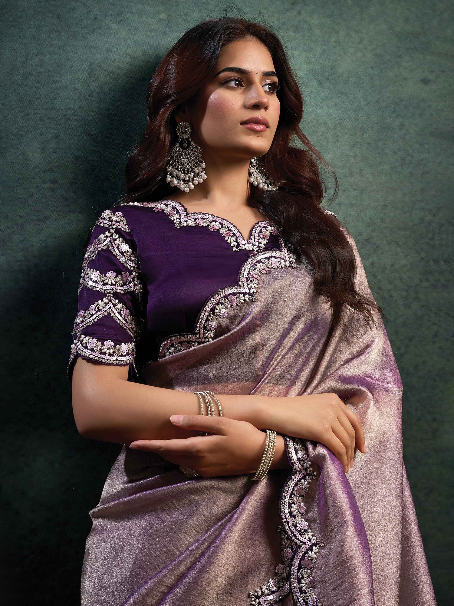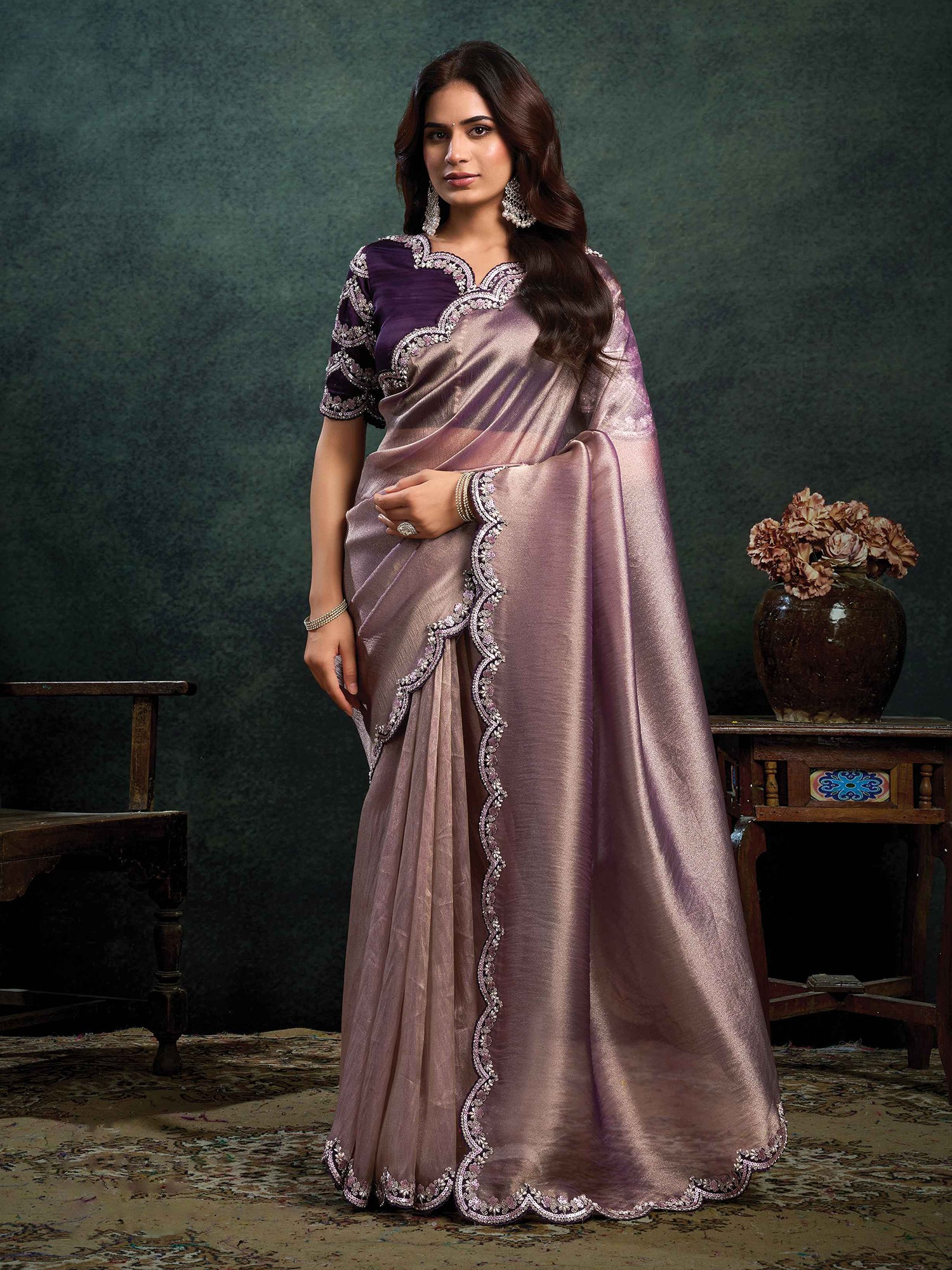 Wedding and Festive Wear Paper Satin Silk Saree with Swarovski and Scallop Zardozi Embroidery in Elegant Traditional Designer Style