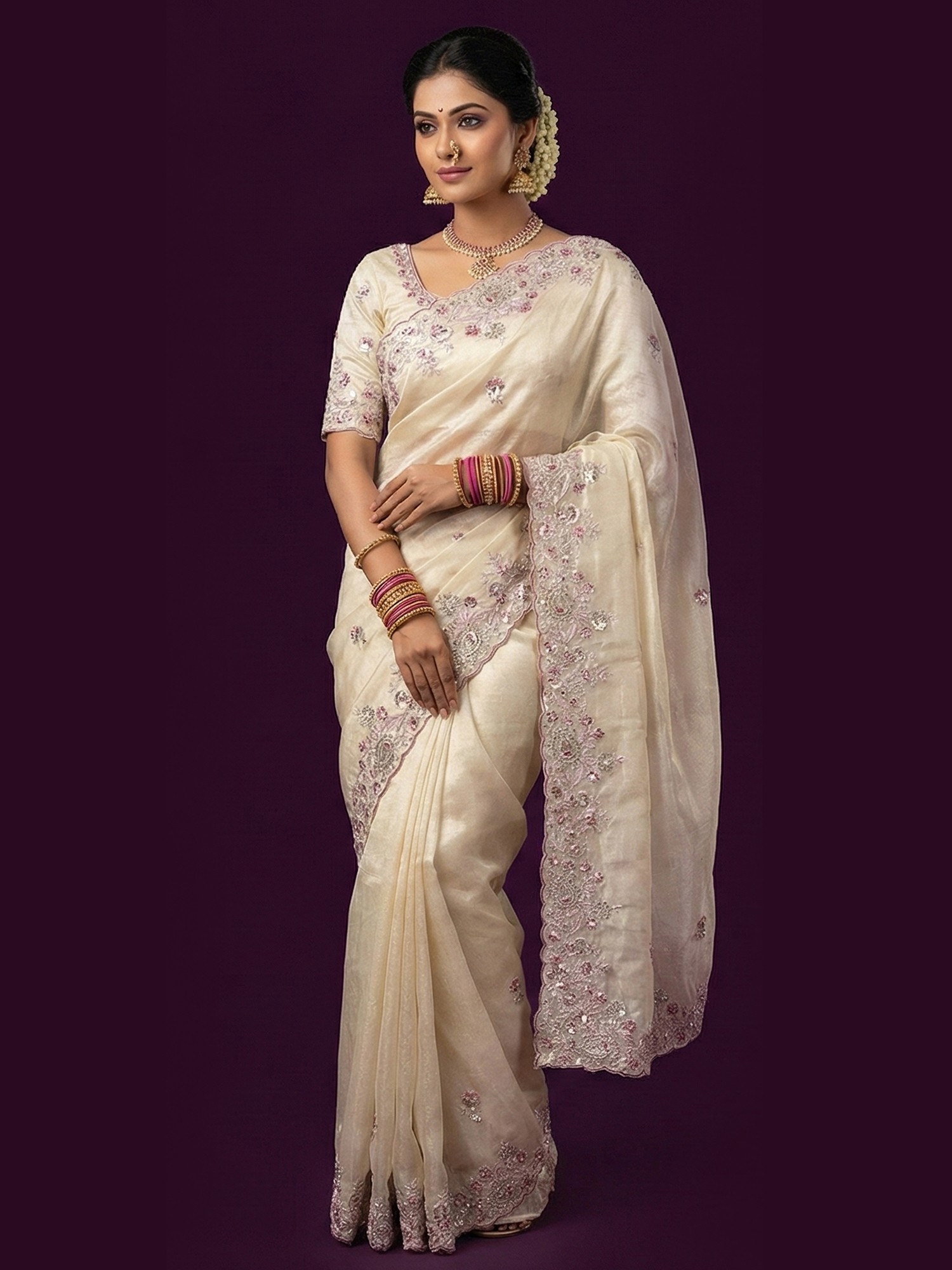 Zari Tissue Silk Saree with Dual Sequins Aari and Zardozi Handwork Crafted for Rich Wedding Party Wear and Festive Occasions