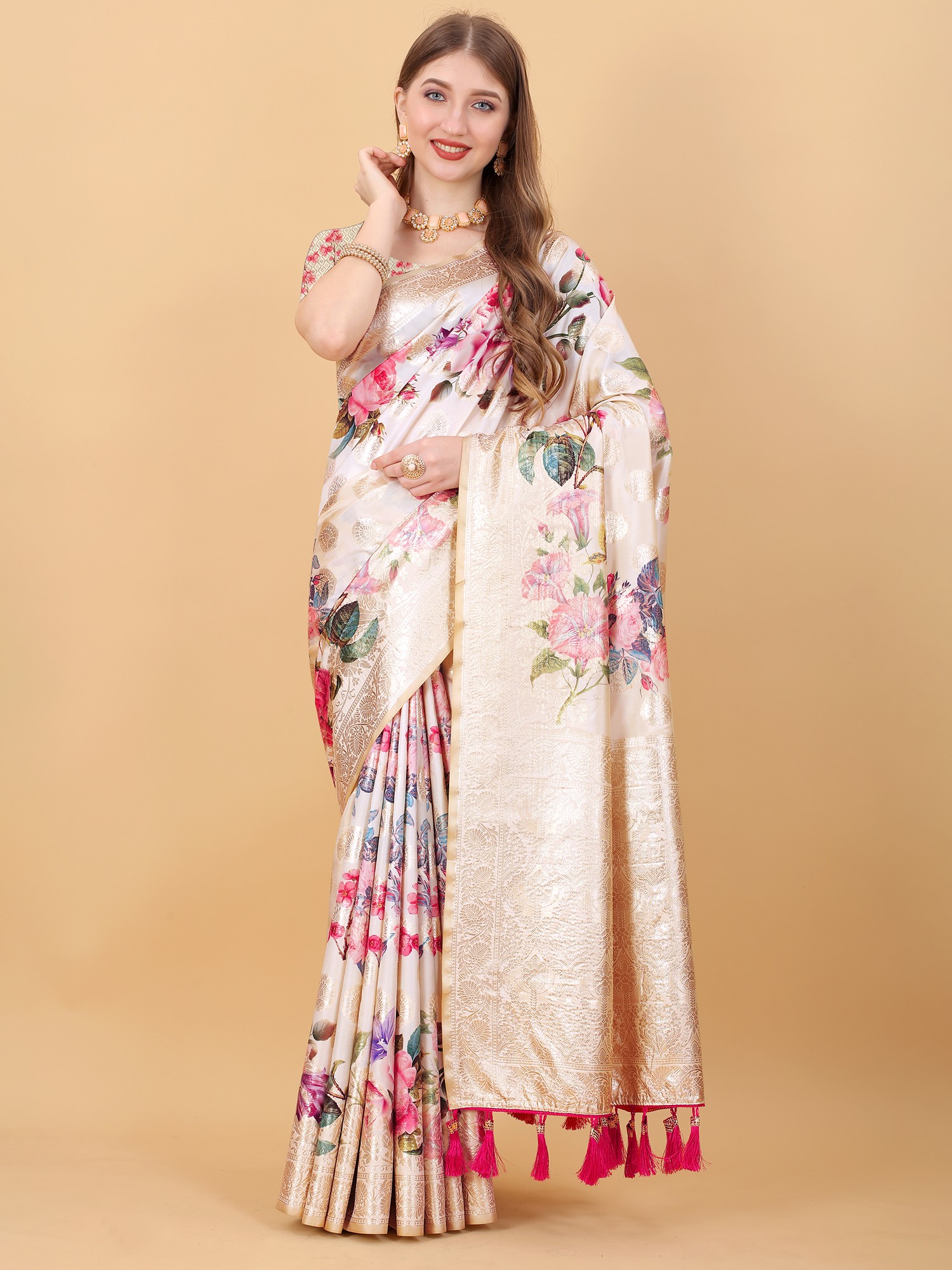 The saree is a captivating dance of color and craftsmanship. The all-over floral print evokes a sense of romance and natural beauty. Vibrant hues intermingle, creating a tapestry of blooms that is both striking and elegant. Adding to the saree's allure is the intricate zari weaving work. The metallic threads catch the light with every movement, creating a subtle shimmer that enhances the richness of the overall design. The zari detailing beautifully frames the floral print, adding structure and definition to the design.