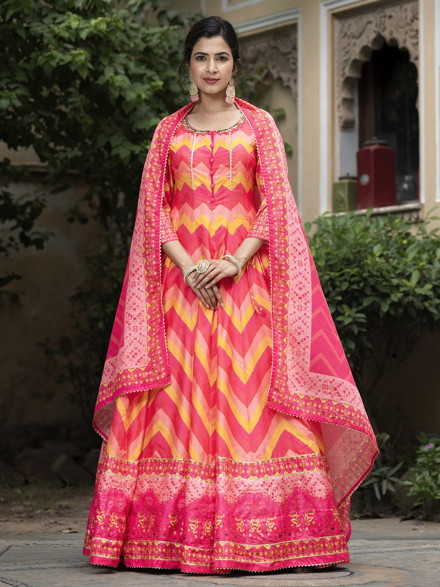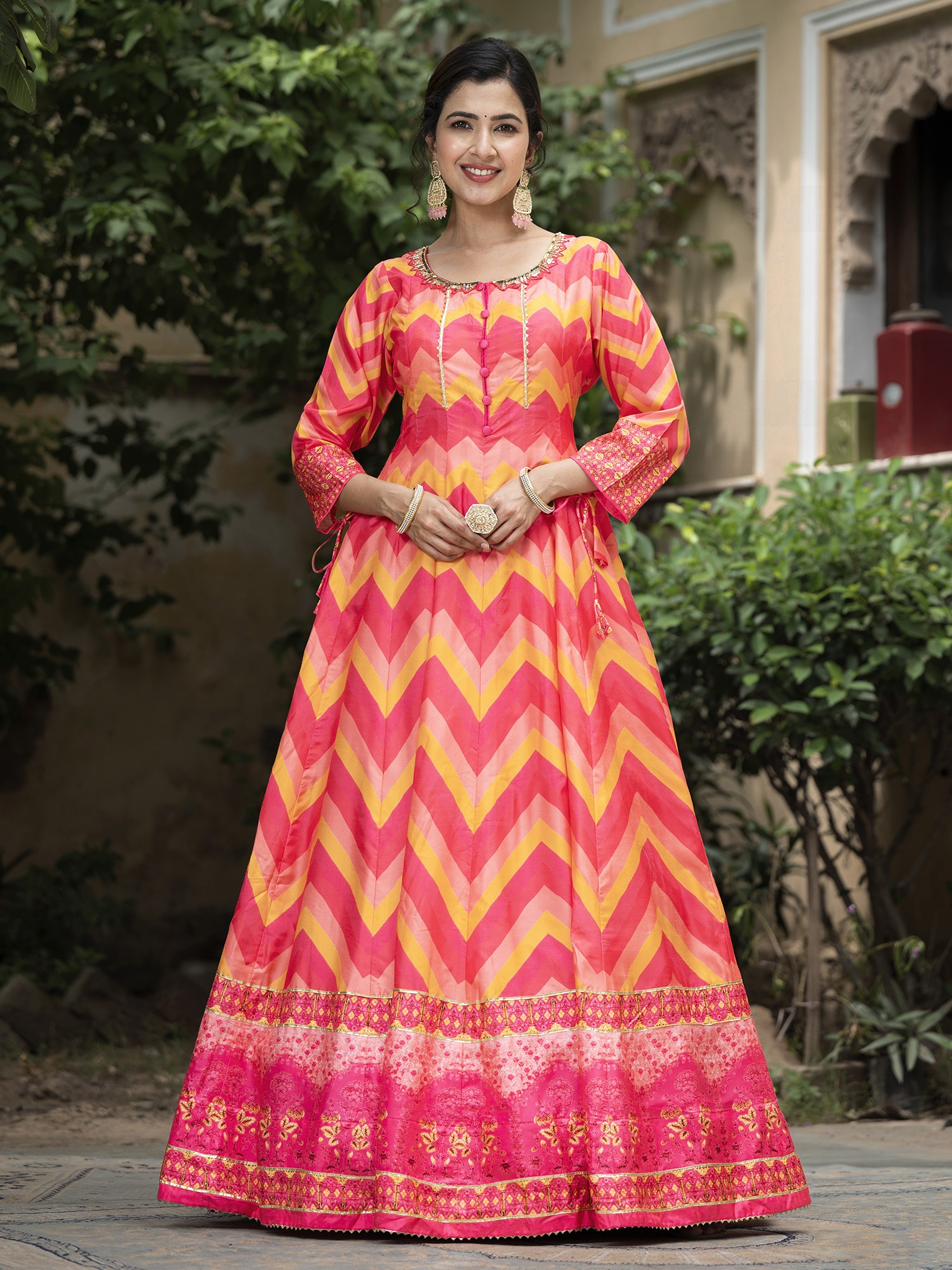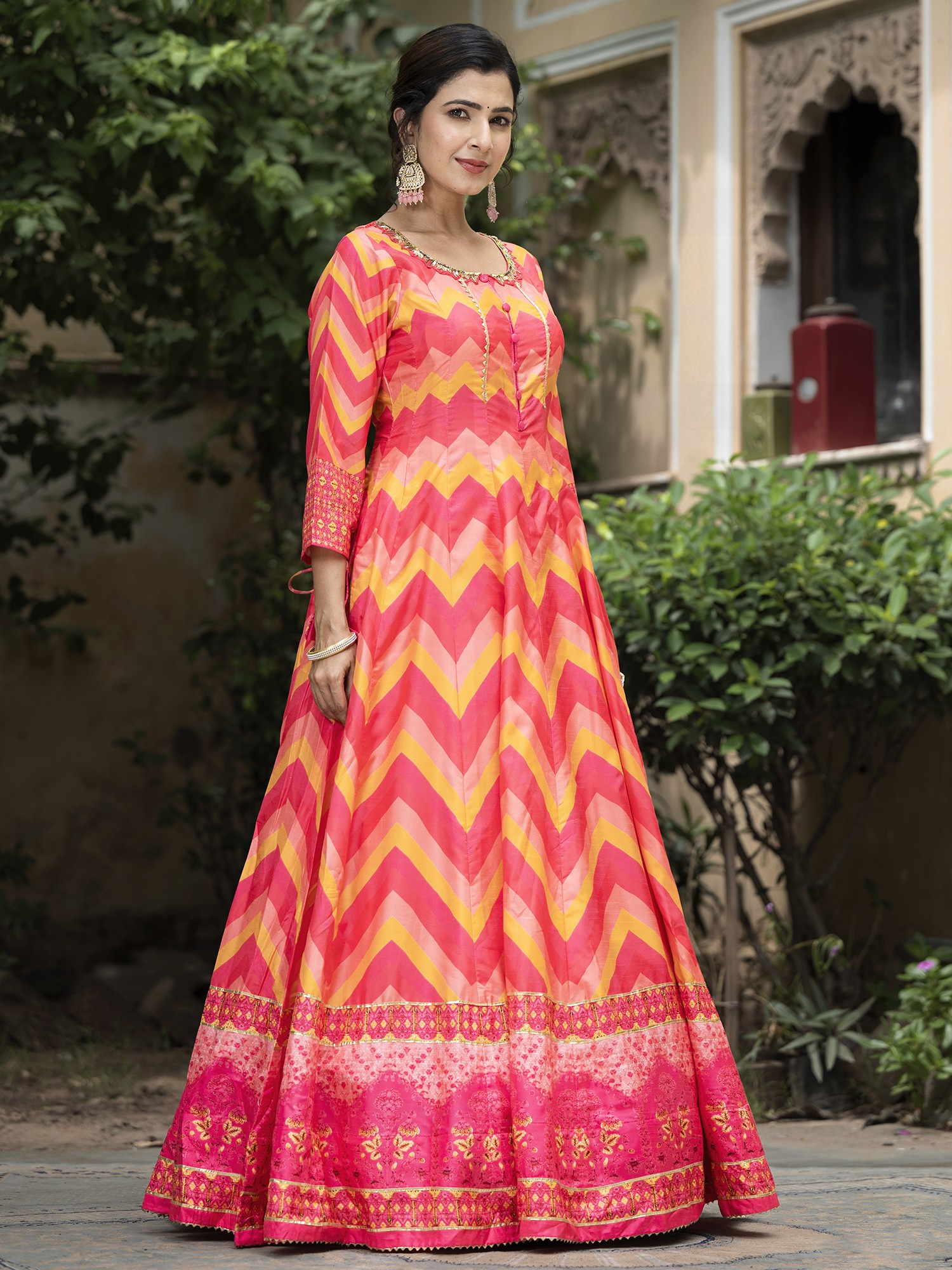 The gown features a visually stunning zig-zag pattern in captivating colors, adding a modern and playful twist to the classic Anarkali style. The vibrant hues create a lively and cheerful aesthetic, perfect for celebrations and festive events. The digital print ensures the design is crisp, clear, and long-lasting, maintaining its vibrancy and appeal wear after wear. The unique pattern breaks away from traditional designs, offering a refreshing and contemporary take on ethnic wear.