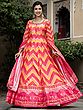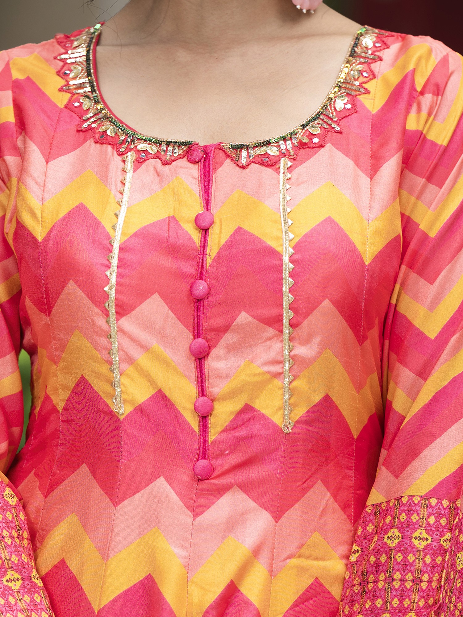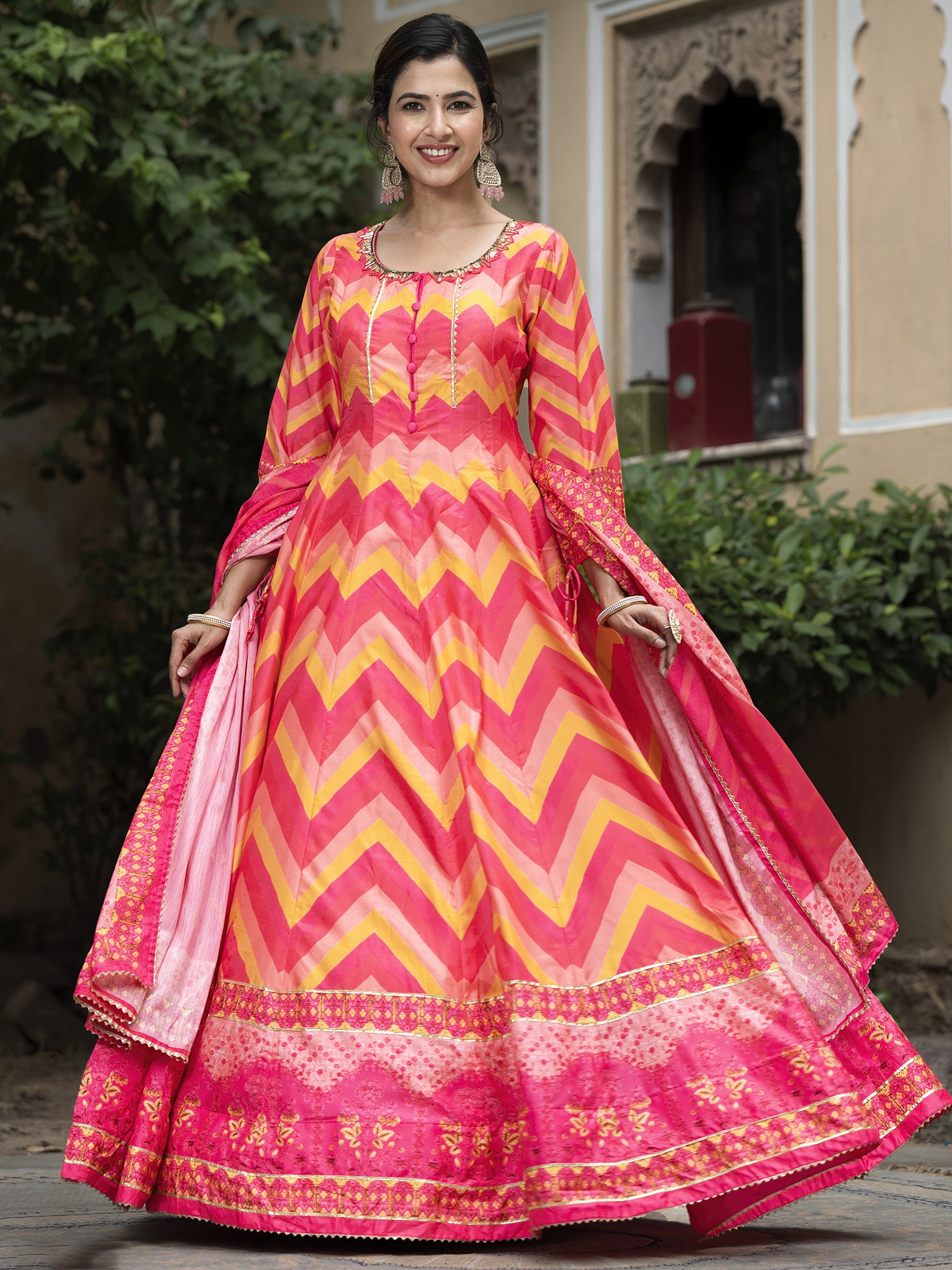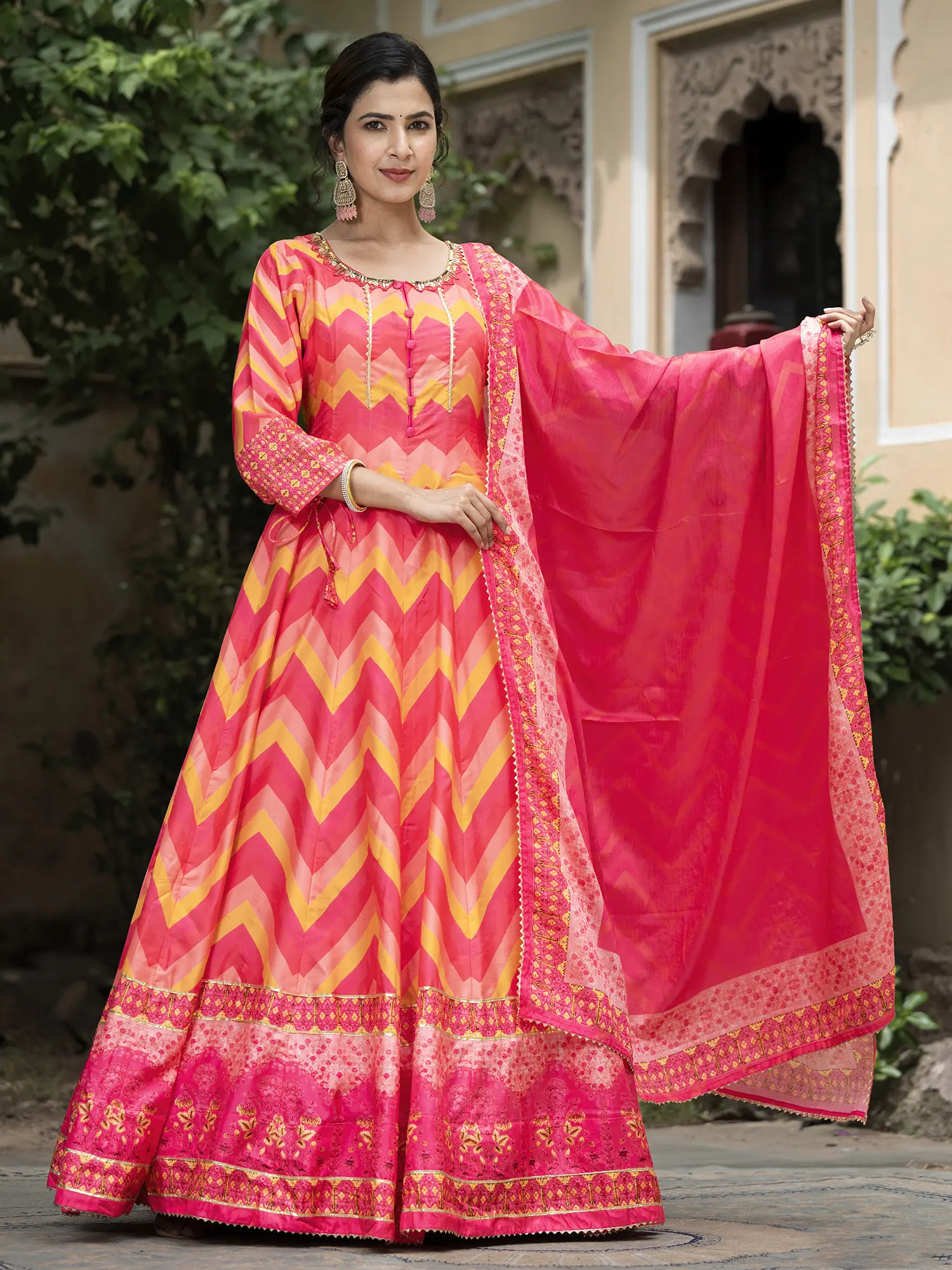 The gown features a visually stunning zig-zag pattern in captivating colors, adding a modern and playful twist to the classic Anarkali style. The vibrant hues create a lively and cheerful aesthetic, perfect for celebrations and festive events. The digital print ensures the design is crisp, clear, and long-lasting, maintaining its vibrancy and appeal wear after wear. The unique pattern breaks away from traditional designs, offering a refreshing and contemporary take on ethnic wear.