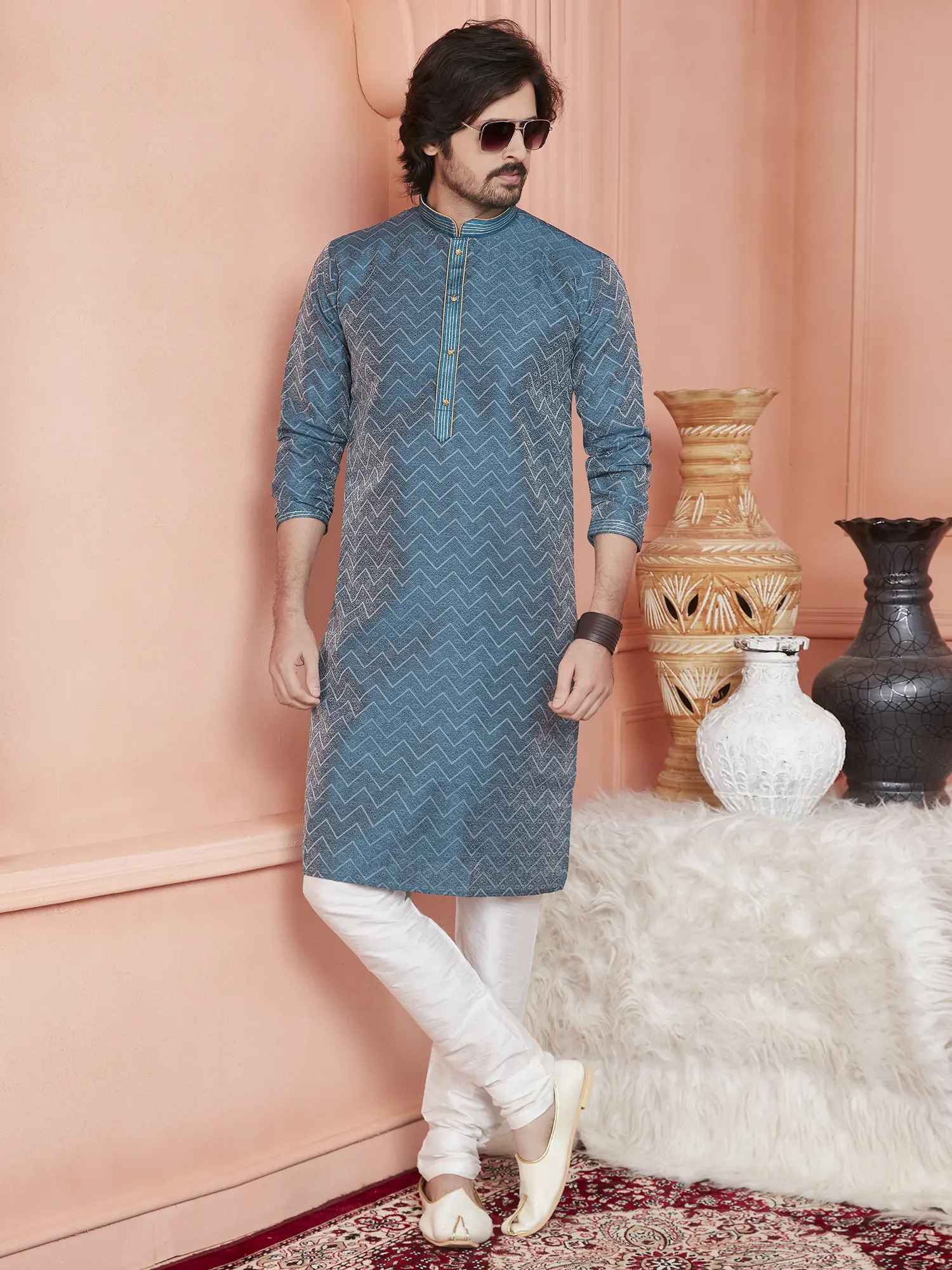 Printed Kurta Pajama with Woven Bootis and Gota-Patti on Neck