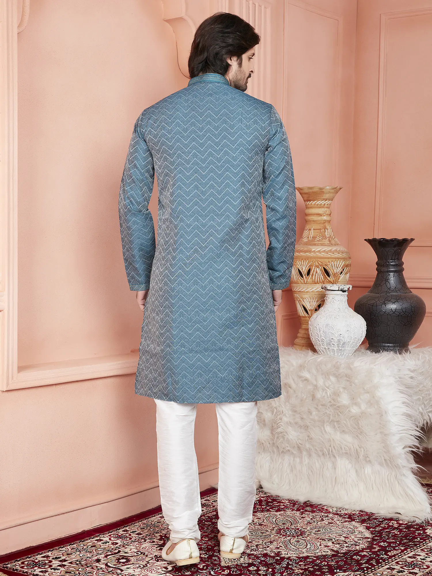 The kurta is fashioned from a luxurious Jacquard Silk Brocade, a fabric known for its rich texture and subtle sheen. The jacquard weave creates a mesmerizing zig-zag pattern that catches the light beautifully, adding depth and visual interest to the garment. This unique pattern elevates the kurta from a simple garment to a piece of wearable art. Adding to the design is the tasteful piping around the neckline and the placket.