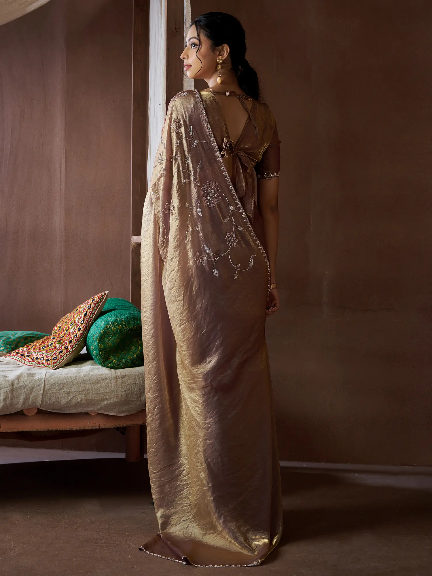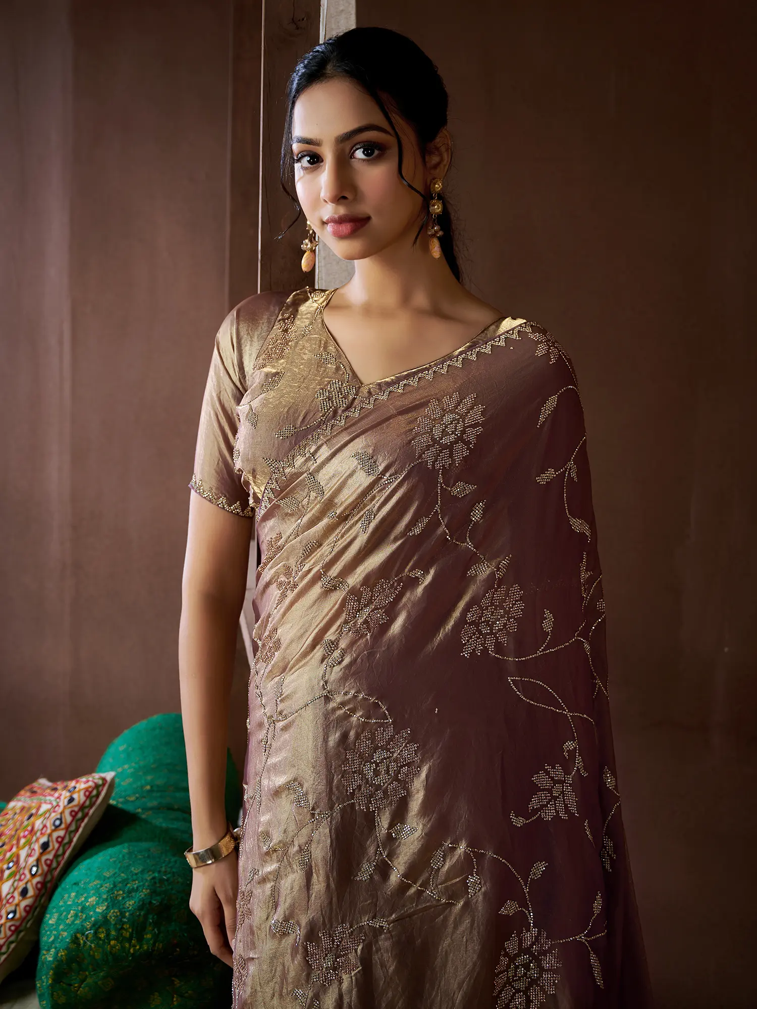The saree's two-tone design is both modern and timeless, ensuring you'll turn heads wherever you go. The subtle interplay of colors creates a visual symphony that is both captivating and elegant. The rich texture of the silk fabric feels luxurious against your skin, offering a delightful sensory experience. The zircon butta work adds a touch of sparkle and sophistication, perfectly complementing the saree's graceful drape. This intricate detail sets it apart, adding a touch of exquisite craftsmanship to the already stunning design. The rich golden and deep bronze tones create a sophisticated palette perfect for evening events or celebrations.