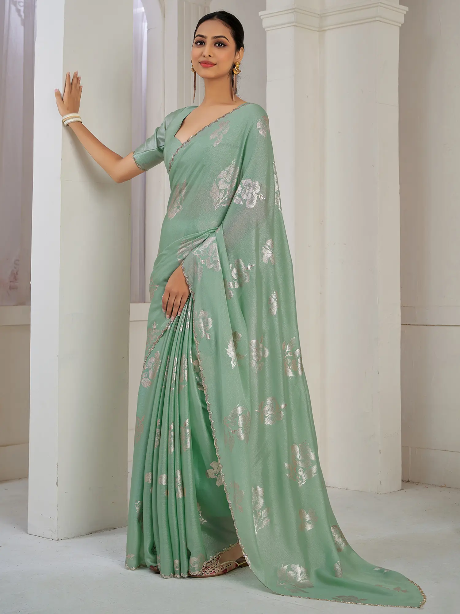 Indulge in the exquisite allure of this stunning mint green chinon silk saree, a masterpiece of design and craftsmanship. The saree's delicate pastel shade is beautifully complemented by a captivating foil print floral pattern in shimmering gold, creating a look that is both sophisticated and modern. The intricate detailing elevates this piece beyond the ordinary, making it perfect for any special occasion, from weddings and festivals to upscale parties and celebratory events. The graceful drape of the chinon silk falls effortlessly, accentuating your figure with a sense of timeless charm.