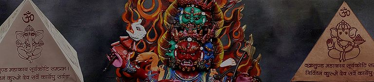 Rahula consequently has a rakshasa-naga fusion appearance. His previous four queens resurrected as his siblings, four rakshasa with different animal faces. These female devils, together with the cosmos and the twenty-eight lunar luminaries, are generally depicted as Rahula's primary entourage of goddesses. A Makara Banner fashioned from the fileted flesh and head of a Makara is in his top right hand.