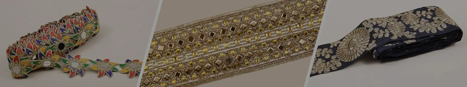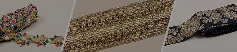 Adding the right laces to an Indian suit or saree blouse is sure to jazz the whole ensemble up. The velvet and silken strips in this section constitute typically Indian motifs such as tendrils and florals. From exquisite gold and silver zariworked motifs to studded faux pearls and crystals, these laces have been designed by hand to add personality to Indian dresses. Conveniently enough, there is a number of base colours to choose from, largely pastel shades to go with a wide variety of colours of the foundation garment.